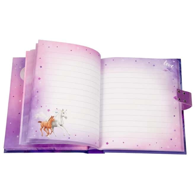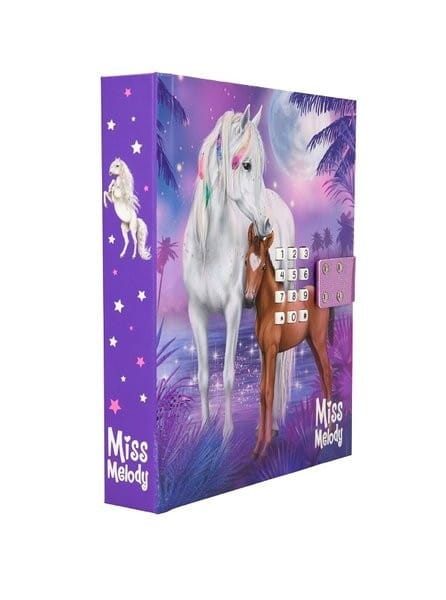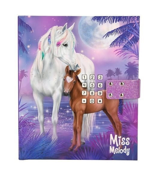 Pamiętnik liczy 100 fioletowych strony w linie, udekorowanych gwiazdkami i miniaturką galopujących koni. Tutaj dziewczynka może zapisywać swoje sekreciki oraz wykonywać szkice i rysunki. Pamiętnik z twarda okładką posiada brokatowe dekoracje oraz wypukły napis Miss Melody.