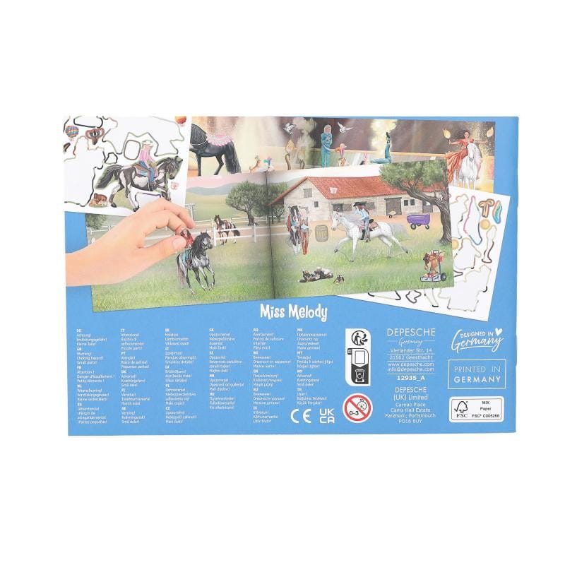 Pięknie wydany graficznie zestaw do naklejania i kreatywnej zabawy Miss Melody Stickerworld w formacie kieszonkowym.