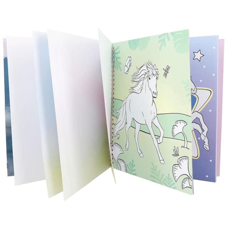 Kolorowanka z naklejkami Miss Melody liczy 20 różnych końskich motywów do kreatywnego kolorowania i ozdabiania. Na okładce znajduje się koń z cekinów, który zmieniają kolor na różowy. Wewnątrz znajduje się arkusz ze srebrno -różowymi naklejkami. Zeszyt na spirali zawiera szkice koni w różnych sceneriach, galopujące nocą po plaży, spacerującego źrebaka, biegające po łące, czy stawające dęba. Kartki papieru są grubsze, można je wyrwać i ozdobione komuś podarować lub przywiesić. Na każdej rozkładówce mamy prawą stronę do kolorowania i lewą gładką, do dowolnego malowania.