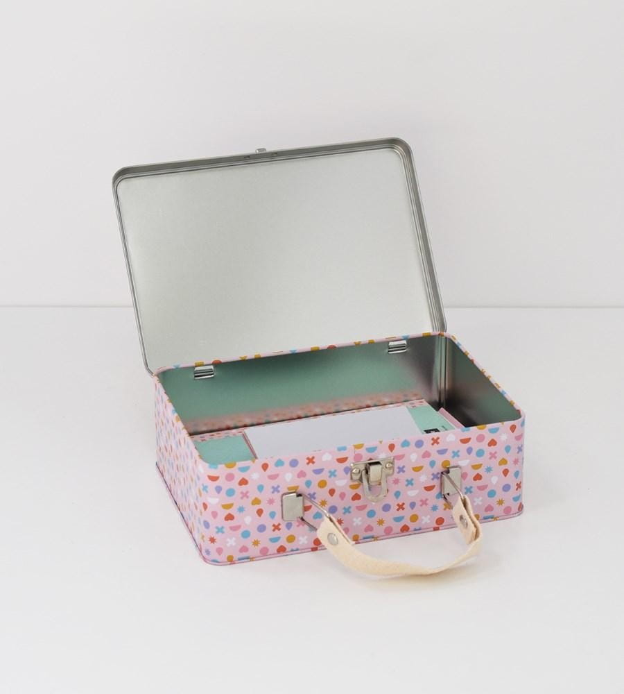 Kreatywny zestaw do tworzenia własnej papeterii Petit Collage zapakowany w piękny metalowy kuferek.