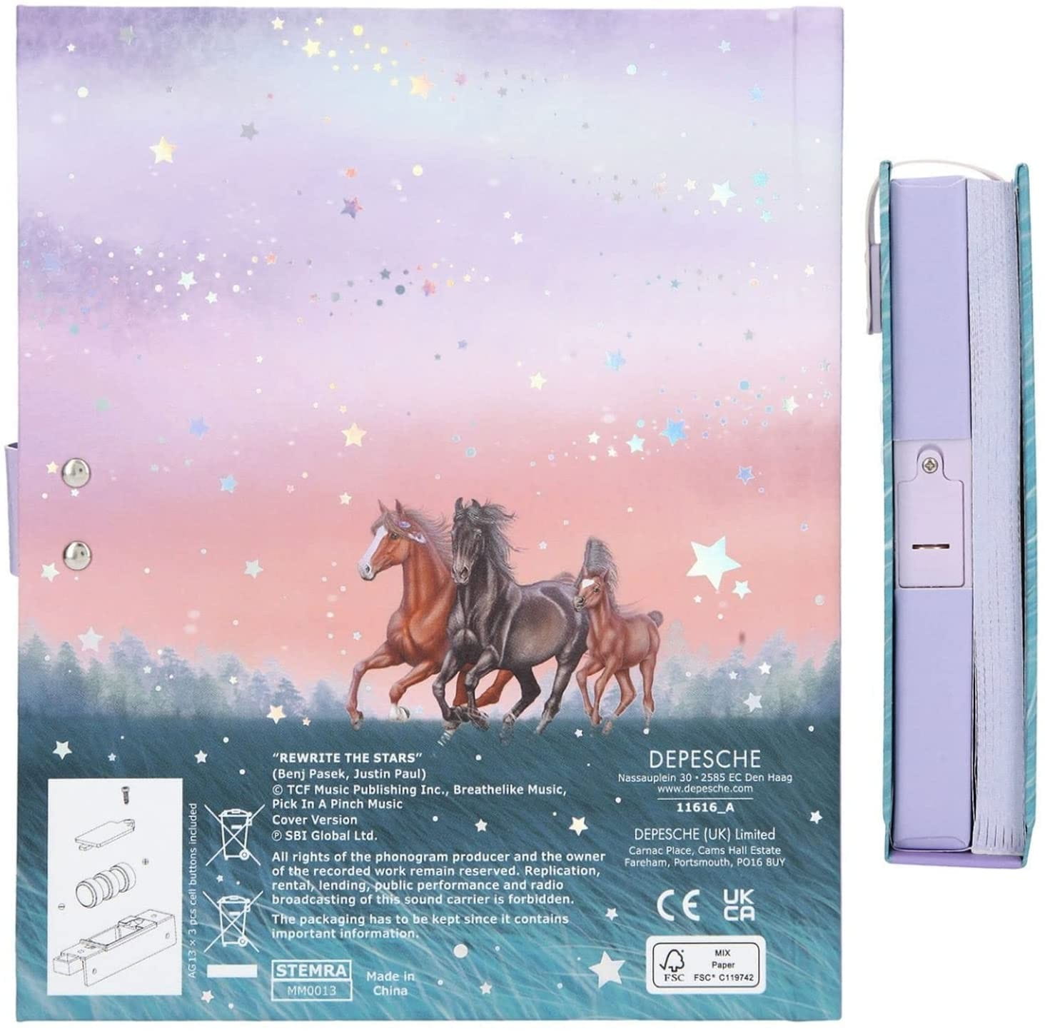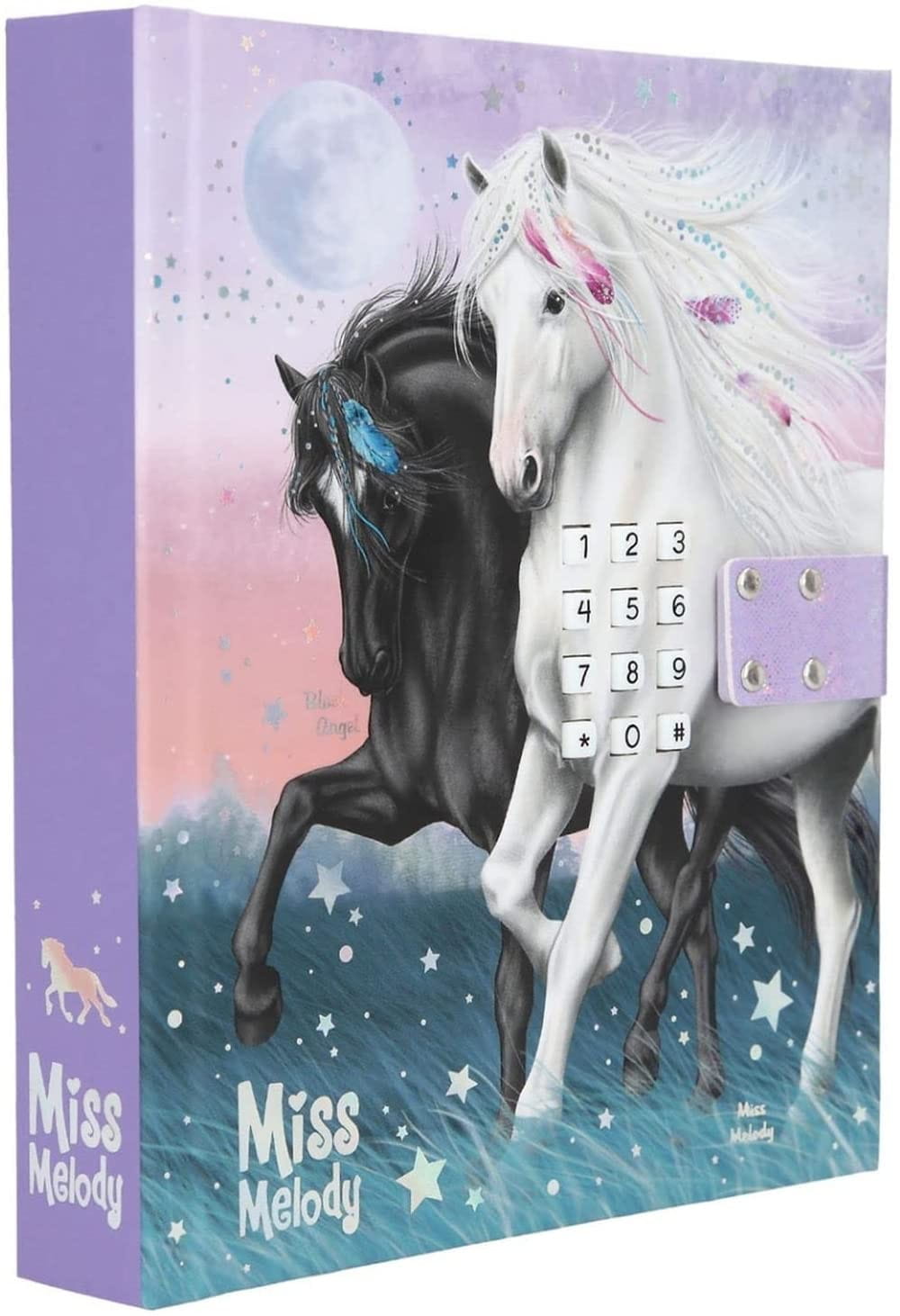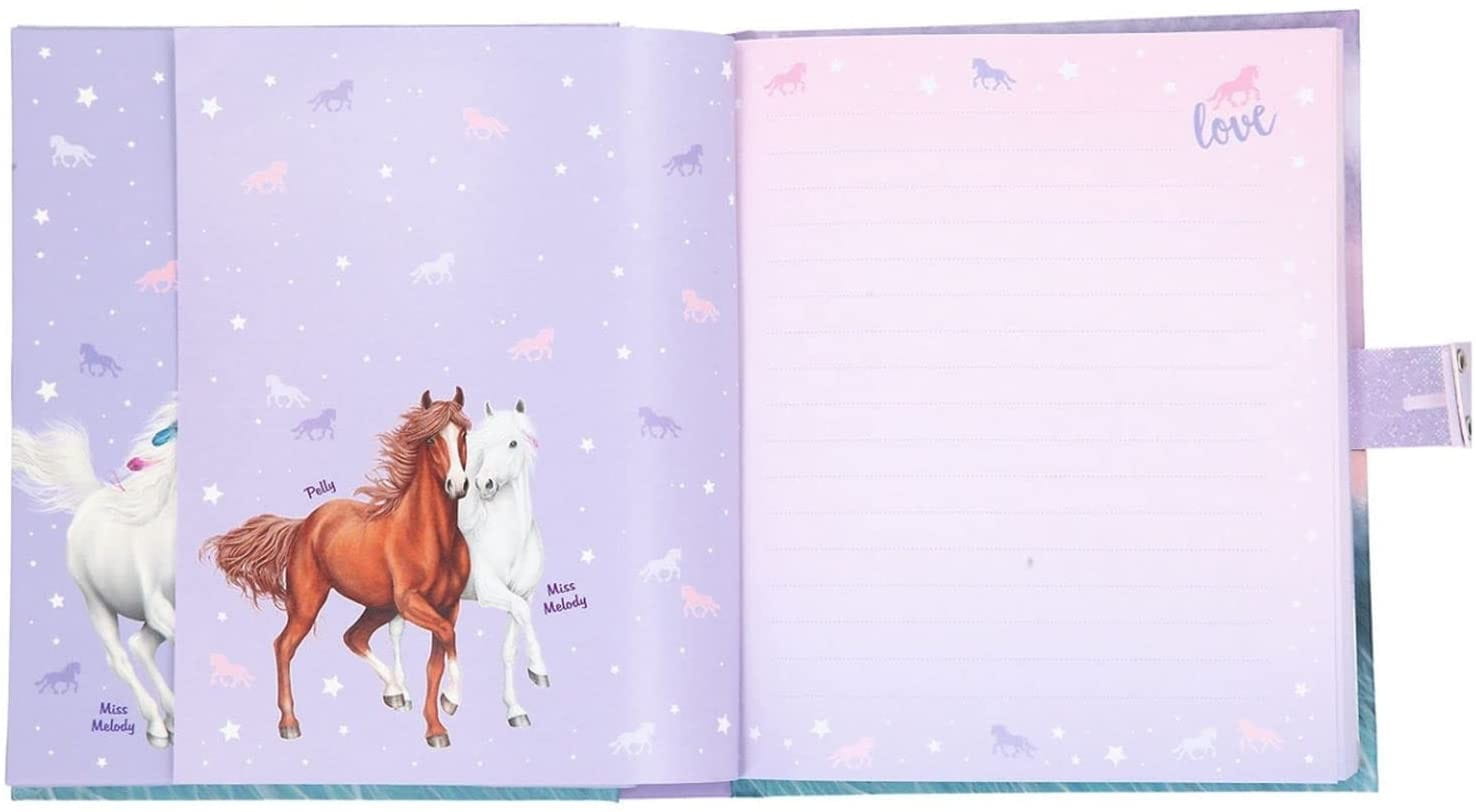 Pamiętnik liczy 100 różowych strony w linie, udekorowanych gwiazdkami i miniaturką koni. Tutaj dziewczynka może zapisywać swoje sekreciki, wspomnienia oraz wykonywać szkice i rysunki. Pamiętnik z twarda okładką posiada błyszczący napis Miss Melody.