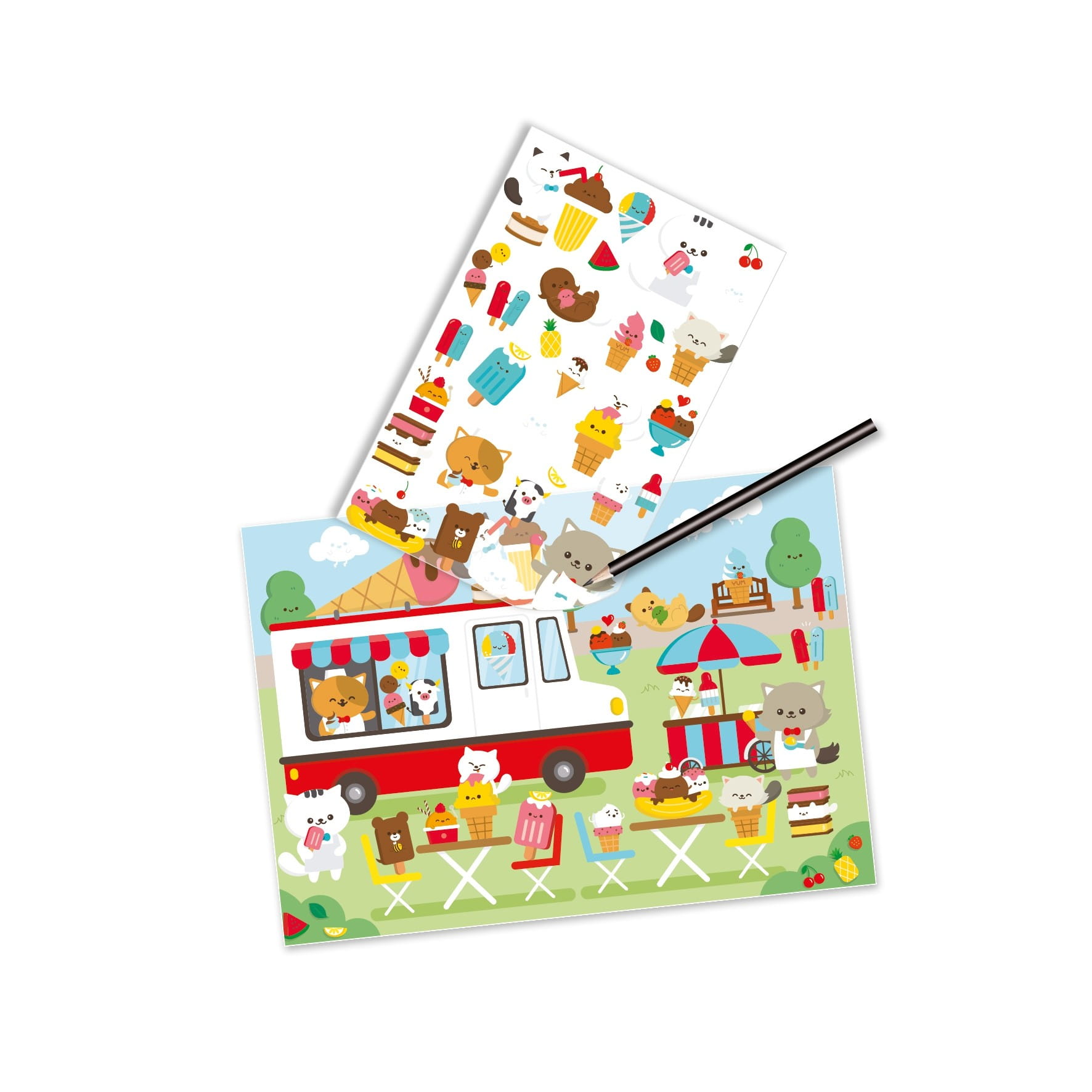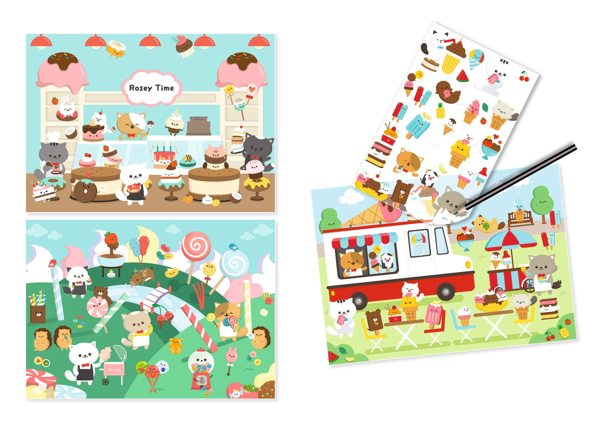 Kalki kopiujące Djeco to świetna stara zabawa, dziś powracająca w zachwycającej grafice. Zadanie polega na wypełnieniu obrazkami tła. Odbywa się to przy pomocy małych szczegółów na kalkach. Tła przedstawiaj wóz z lodami, cukiernię i krainę słodyczy, a kalki mnóstwo ciekawych detali do naniesienia. Dzieci mają pełną dowolność, tworzą to co podpowie im wyobraźnia.