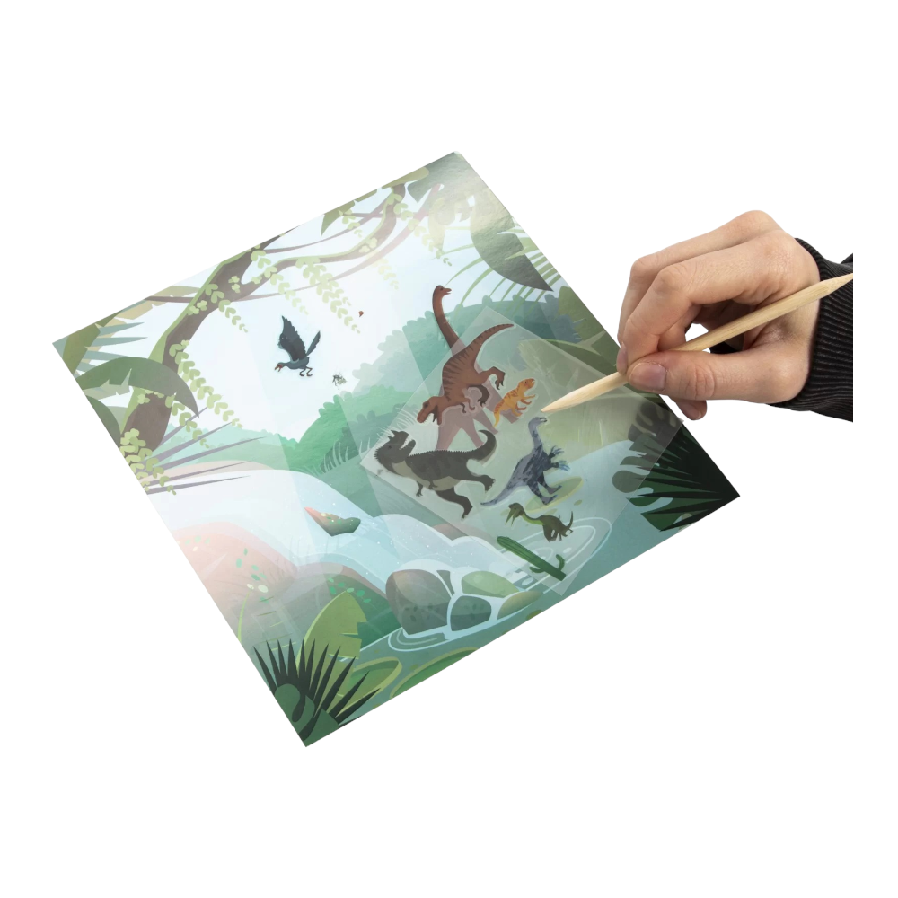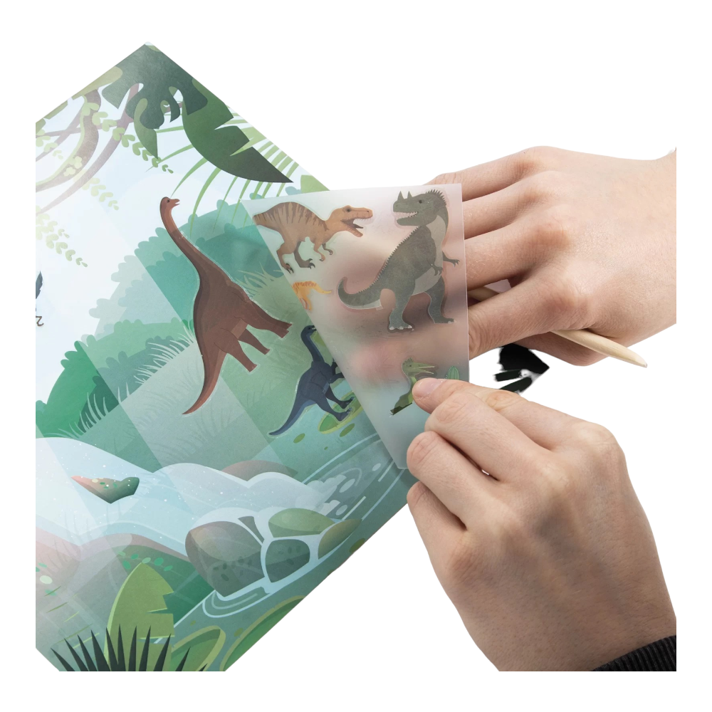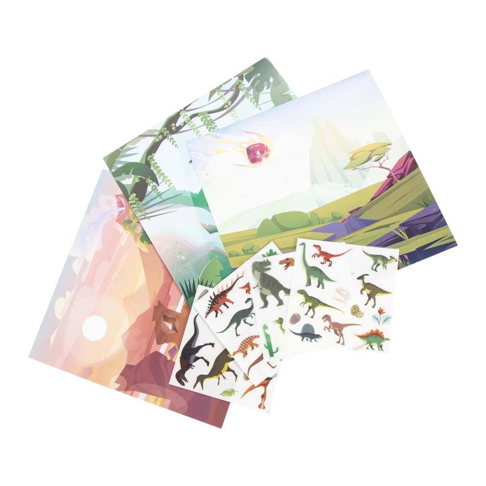 W tym kreatywnym zestawie znajdują się trzy arkusze z tłem do ozdobienia, cztery arkusze folii z dinozaurami oraz drewniany rysik