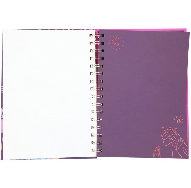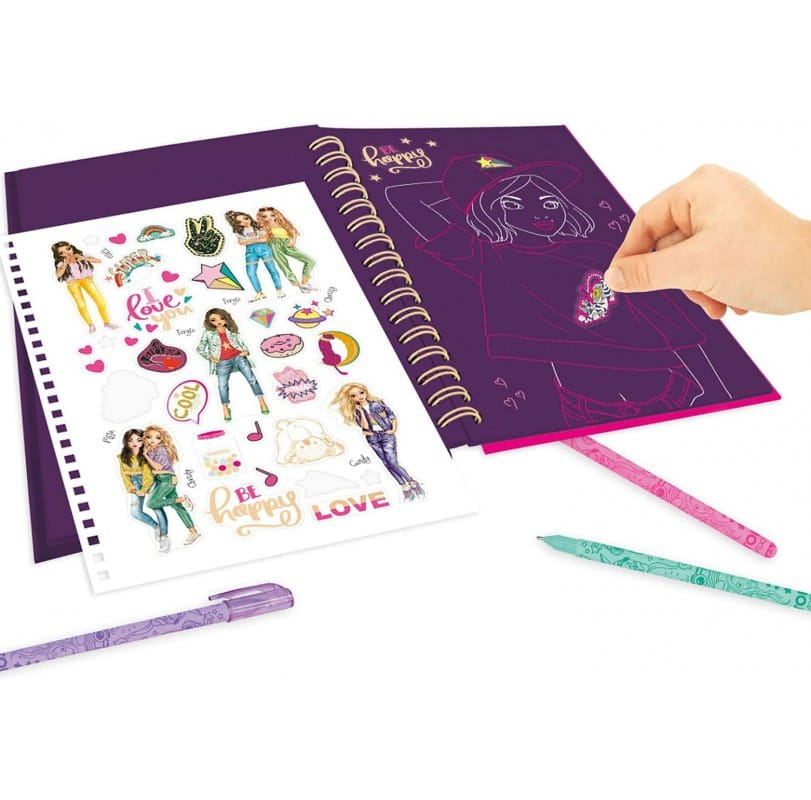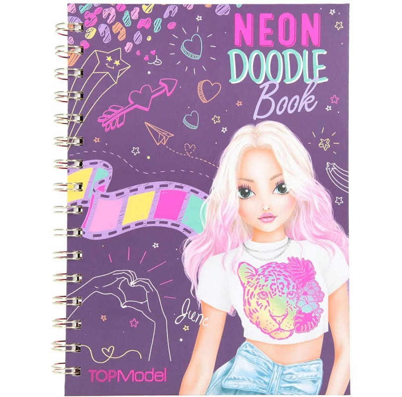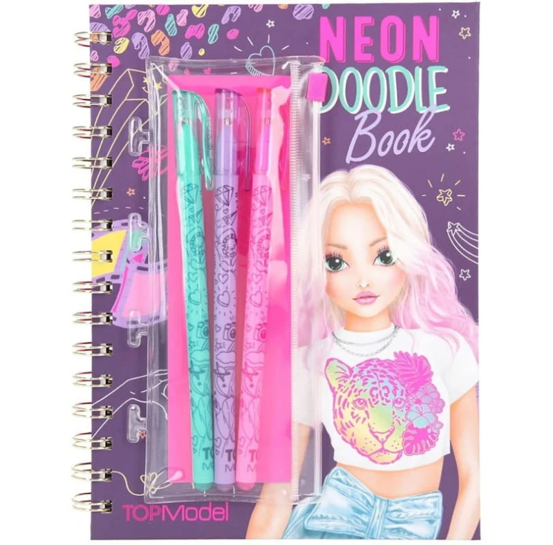Kreatywny zestaw Top Model Neon Doodle Book to kolorowanka z fioletowymi stronami, naklejki oraz komplet neonowych pisaków w mini piórniku. Wnętrze notesu mieści arkusz z błyszczącymi naklejkami oraz młodzieżowo zaaranżowane strony do ozdabiania np. napis LOVE, be happy, strony gładkie i z delikatnym konturem do ozdabiania. Neonowe cienkopisy uświetnią grafikę i przydadzą się też w szkole.