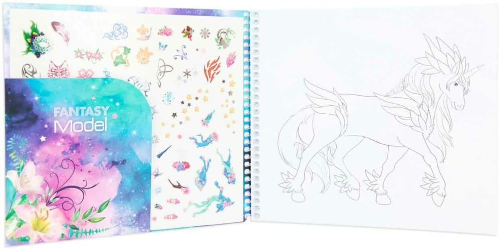 Kolorowanka z naklejkami Fantasy Model liczy 24 stron do kreatywnego kolorowania i ozdabiania błyszczącymi naklejkami. W okładce znajdują sie przegródki wypełnione arkuszami naklejek o fantastycznych motywach z baśni. Zeszyt na spirali zawiera szkice do pokolorowania i ozdobienia naklejkami, m.in. jednorożce, konie, ptaki, narwala. Kartki papieru są grubsze, można je wyrwać i ozdobione komuś podarować lub przywiesić.