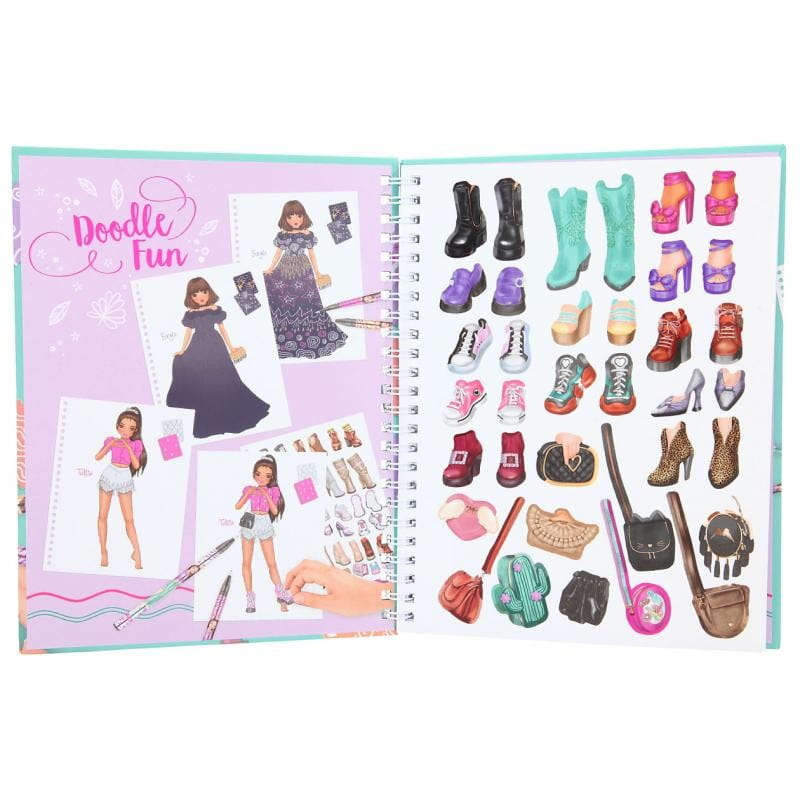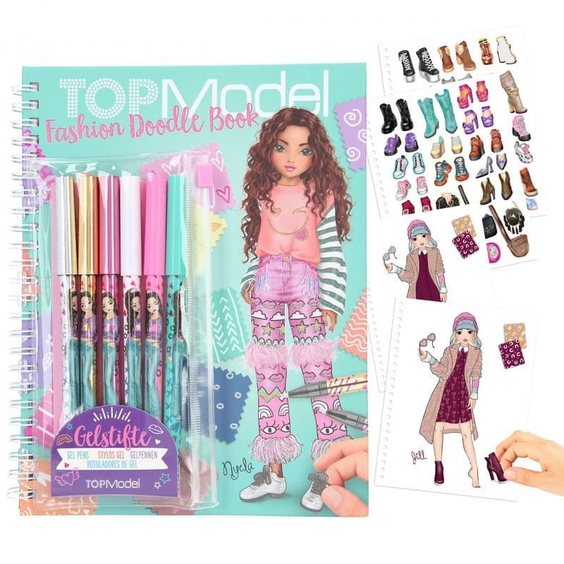 Zestaw do projektowania mody TopModel zawiera wszystko co potrzebne do stworzenia modowych kreacji. Szkicownik Fashion Doodle Book będzie spełnieniem marzeń małej projektantki mody, a także prezentem, który bardzo ucieszy dziewczynkę. Kołonotatnik zawiera 30 stron z wizerunkiem dziewczyn oraz 2 arkusz z naklejkami i błyszczącymi dodatkami do ubrań. Na okładce umieszczany jest piórniczek z 6-cioma żelowymi, brokatowymi długopisami.