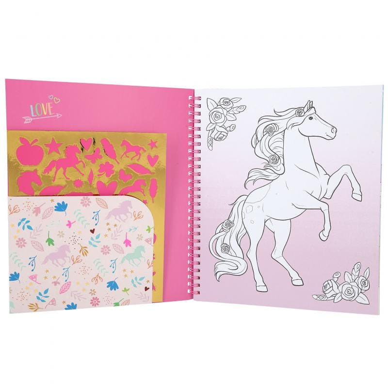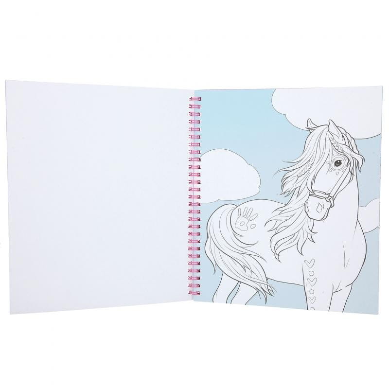 Kolorowanka z naklejkami Miss Melody liczy 40 stron do kreatywnego kolorowania i ozdabiania. Na okładce znajduje się miękka aplikacja z koniem. Wewnątrz znajduje się arkusz ze złoto-różowymi naklejkami. Zeszyt na spirali zawiera szkice koni w różnych sceneriach, galopujące nocą po plaży, spacerującego źrebaka, biegające po łące, czy swatające dęba. Kartki papieru są grubsze, można je wyrwać i ozdobione komuś podarować lub przywiesić.