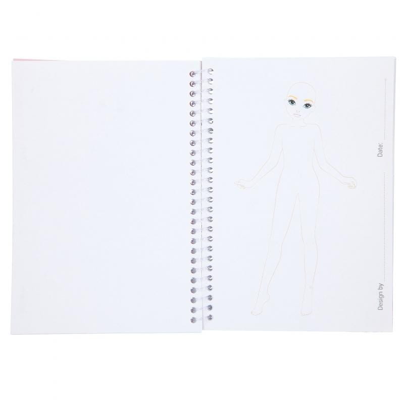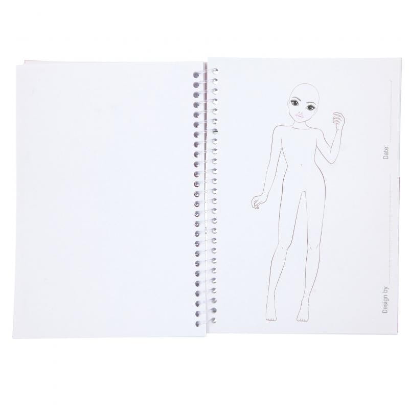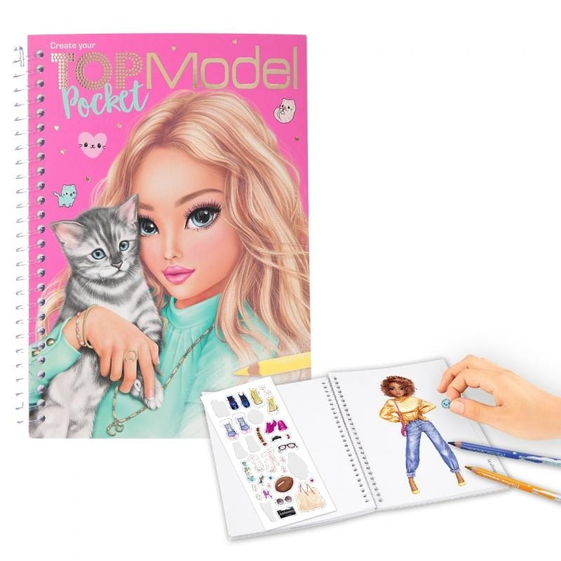 Kieszonkowy notes szkicownik z obrysami sylwetek do kolorowania i naklejania Create your Top Model Pocket. Kieszonkowy notesik można mieć zawsze pod ręką, w podróży i w domu, gdy do głowy wpadnie nowy projekt. Kolorowanka zawiera arkusz z naklejkami oraz kontury ciała, do których domalowujemy ubrania, buty, biżuterię, a nawet kolor i długość włosów.
