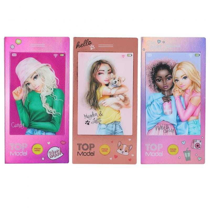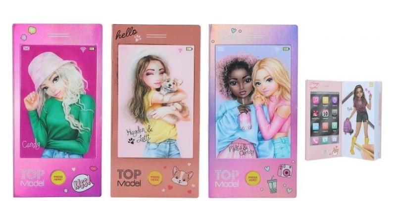 Kieszonkowy notesiki z trójwymiarową okładką z modelkami, która zmienia się wraz z ruchem notesu. Wnętrze notesu i miejsce na notatki są w kształcie wiadomości tekstowych. Notatniki TOPModel w stylu smartfona jest zaprojektowanych jak rozmowa na czacie.