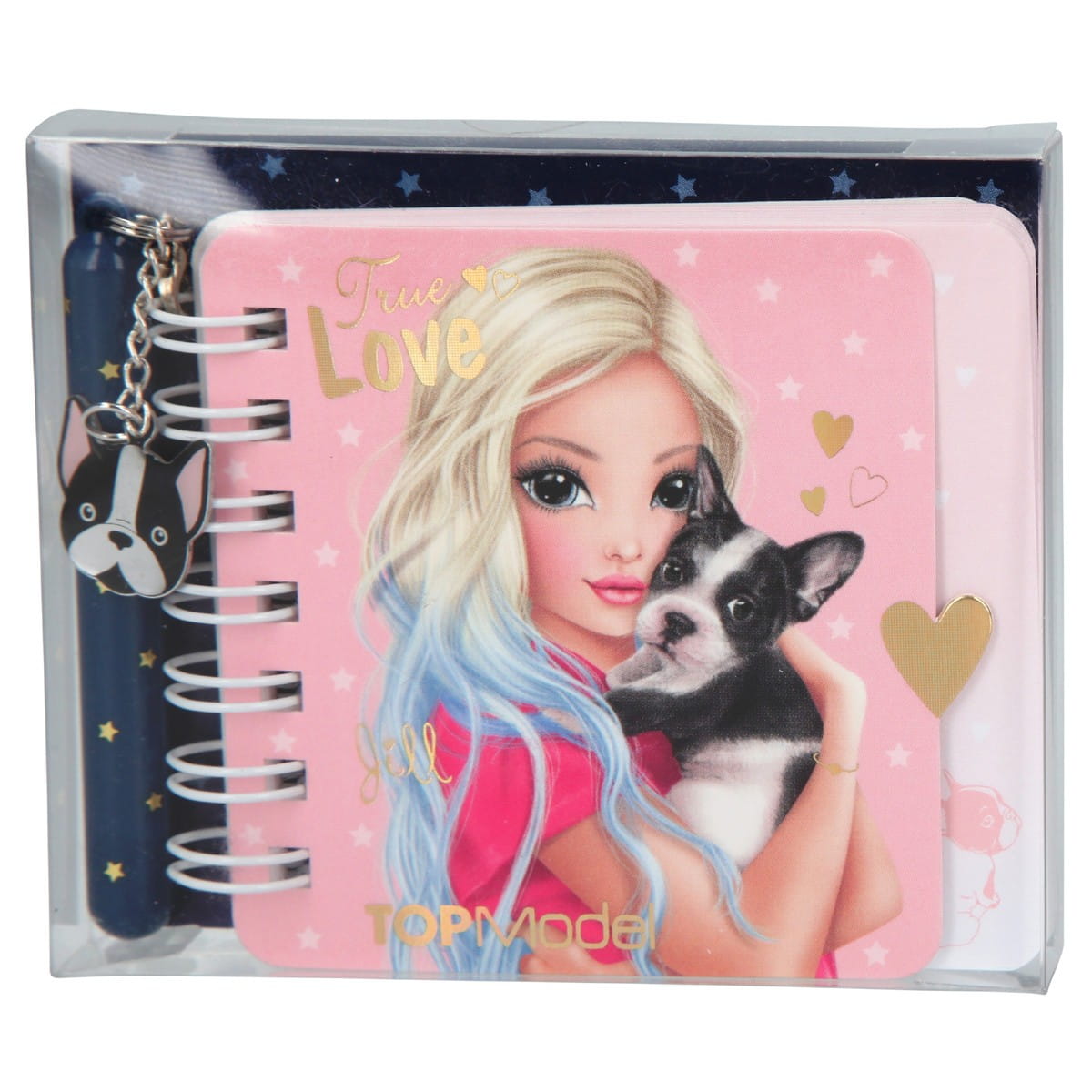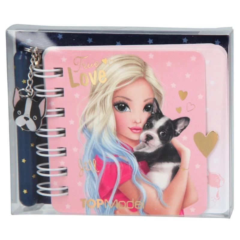 Kieszonkowy, mały notesik Top Model z długopisem piszącym w kolorze niebieskim oraz przywieszką z pieskiem. Uroczy notesik zawiera wewnątrz różowe karteczki do sporządzania notatek, rysunków lub wymieniania się z koleżankami. Notes kołowy ma przypięty mały, granatowy długopis. Okładka z modelką Jill i pieskiem ma połyskujące elementy. Wewnątrz karteczki w kolorze pastelowo- różowym z białymi gwiazdeczkami oraz szkicem piesków w narożniku.