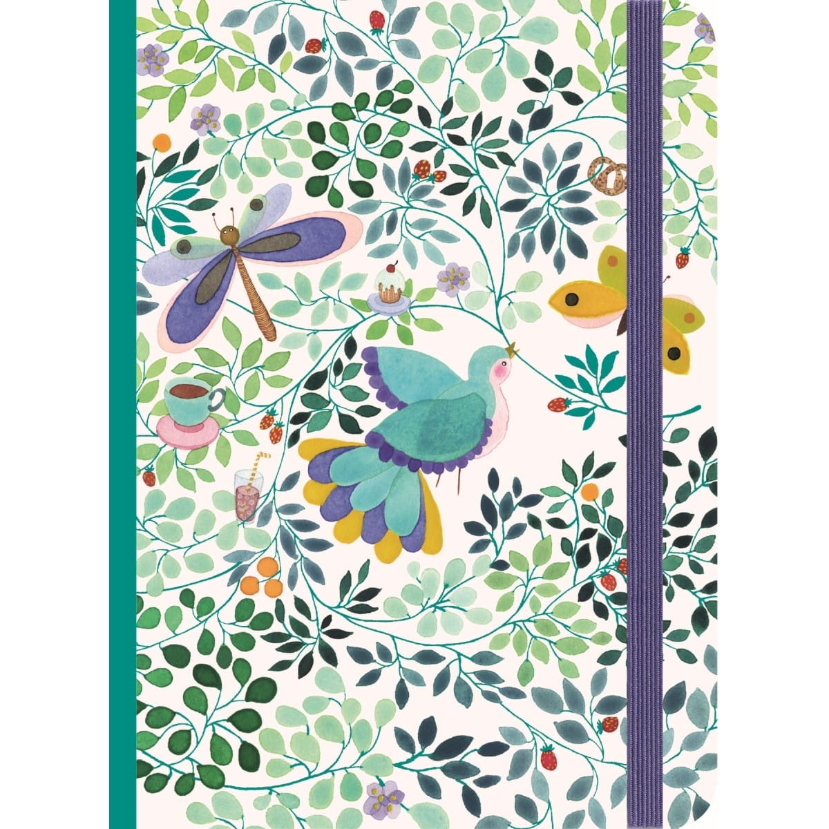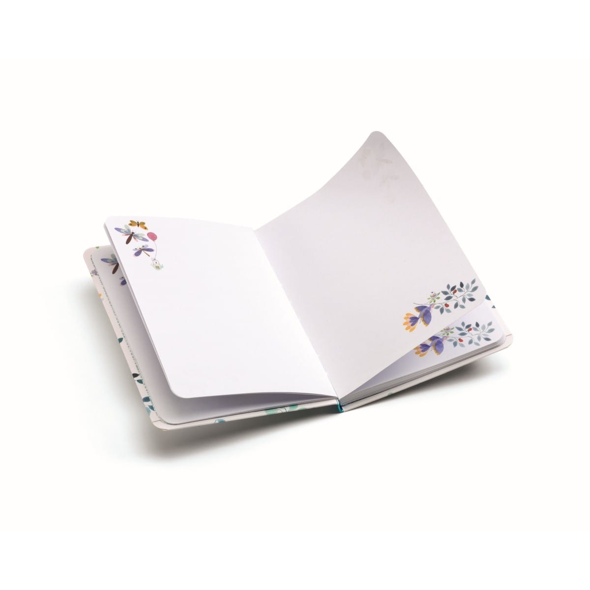 Kieszonkowe notesiki Djeco w pięknej stylizacji z motywami roślinnymi, motylami. Okładka lekko połyskuje, a notesik jest zapinany na elastyczną gumkę. Notes posiada gładkie strony, subtelnie udekorowane na górze lud dole w motyle, kwiaty lub ptaki. Notes do zapisywania codziennych spraw, zadań, planowania, wykonywania rysunków. Niewielki rozmiar i waga idealnie mieści się w torebce lub plecaku. Piękny prezent.