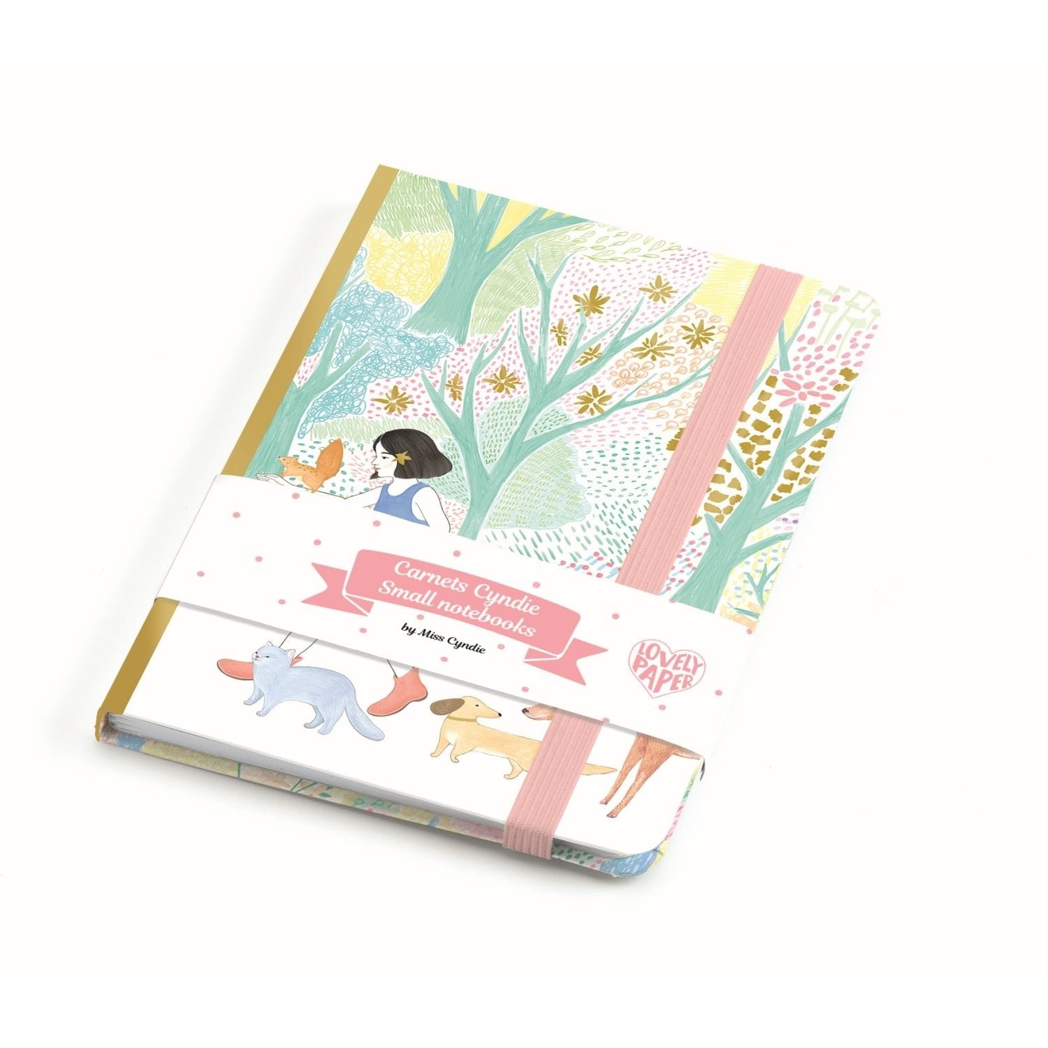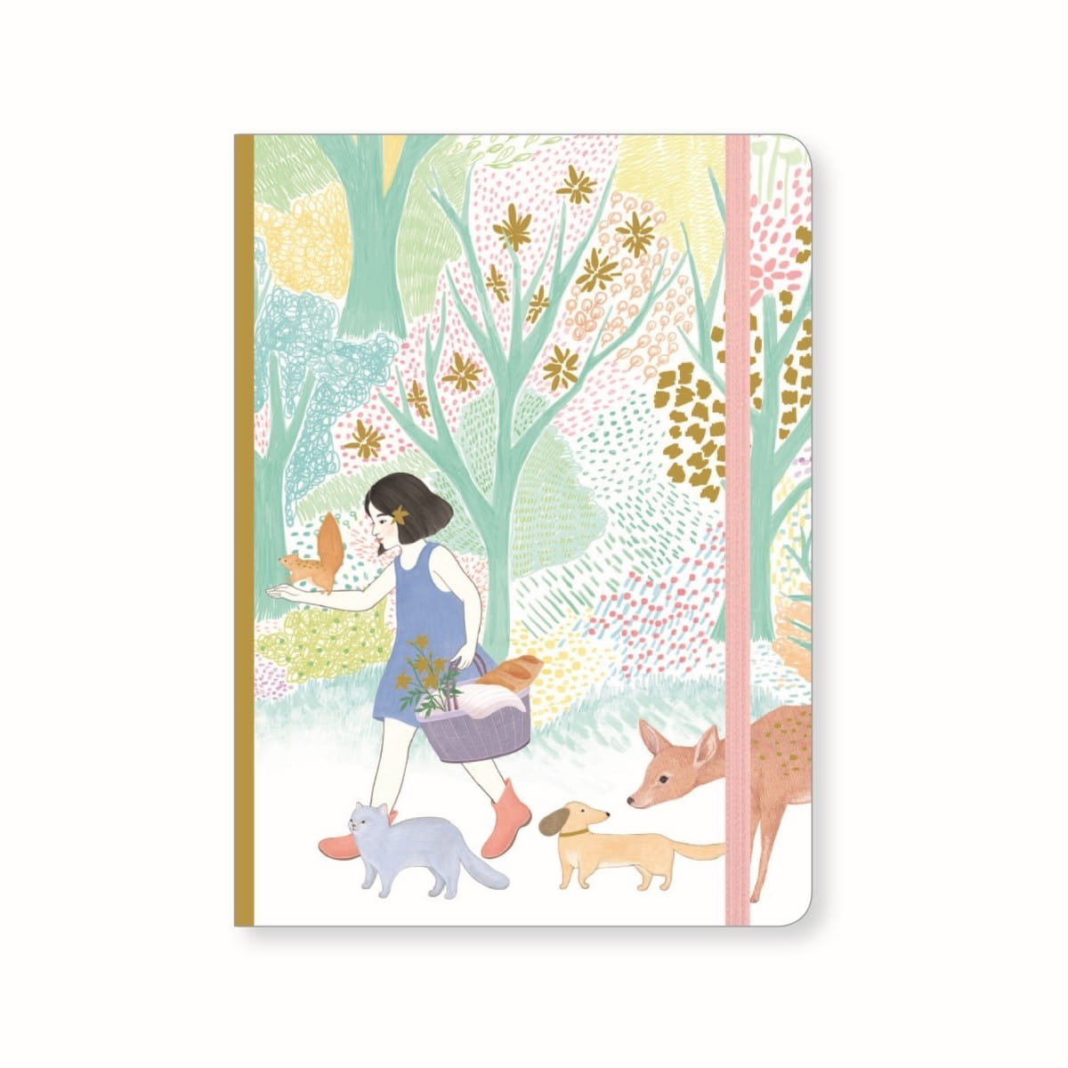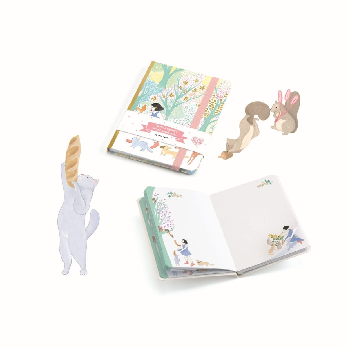 Kieszonkowe notesiki Djeco w pięknej stylizacji przedstawiający spacer po lesie Okładka lekko połyskuje, a notesik jest zapinany na elastyczną gumkę. Notes posiada gładkie strony, subtelnie udekorowane na górze lud dole. Notes do zapisywania codziennych spraw, zadań, planowania, wykonywania rysunków. Niewielki rozmiar i waga idealnie mieści się w torebce lub plecaku. Piękny prezent.