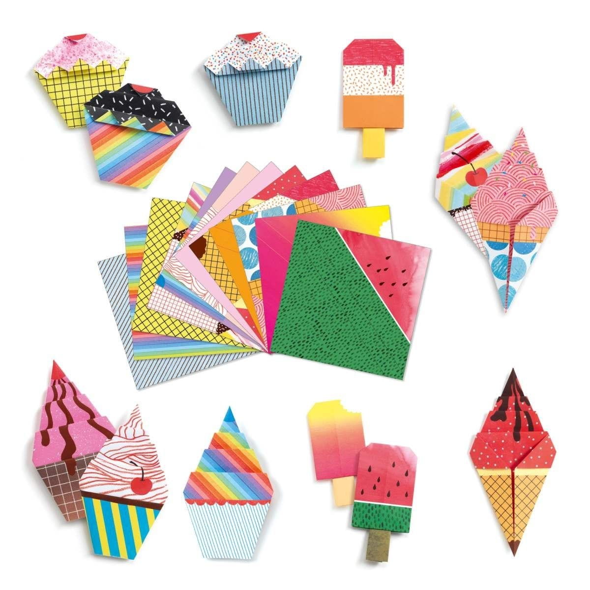 Lody, babeczki i ciasteczka składane z papieru Origami Djeco to kreatywna zabawa polegająca na zaginaniu kolorowych kartek papieru wg wzoru i wyznaczonych linii. Zestaw mieści się w zgrabnej tekturowej teczce i zawiera wszystko co niezbędne do stworzenia wielu smakołyków oraz instrukcję jak składać krok po kroku.