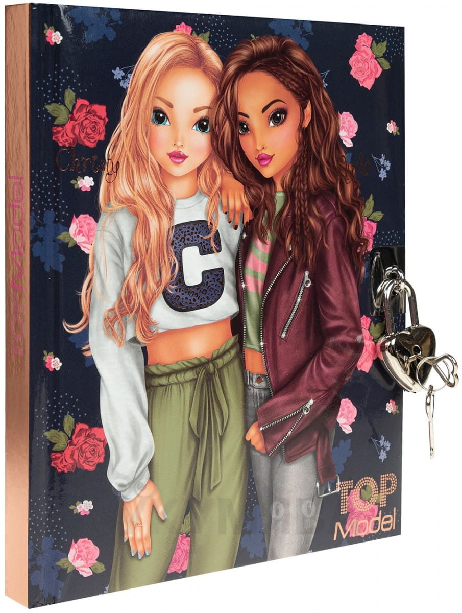 Pamiętnik oprawiony w twardą okładkę w kolorze granatowym z rózami, przedstawia modelki Nyele i Christy.