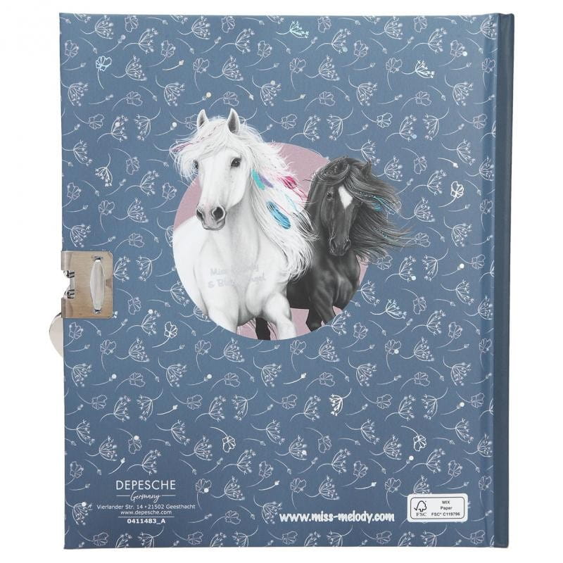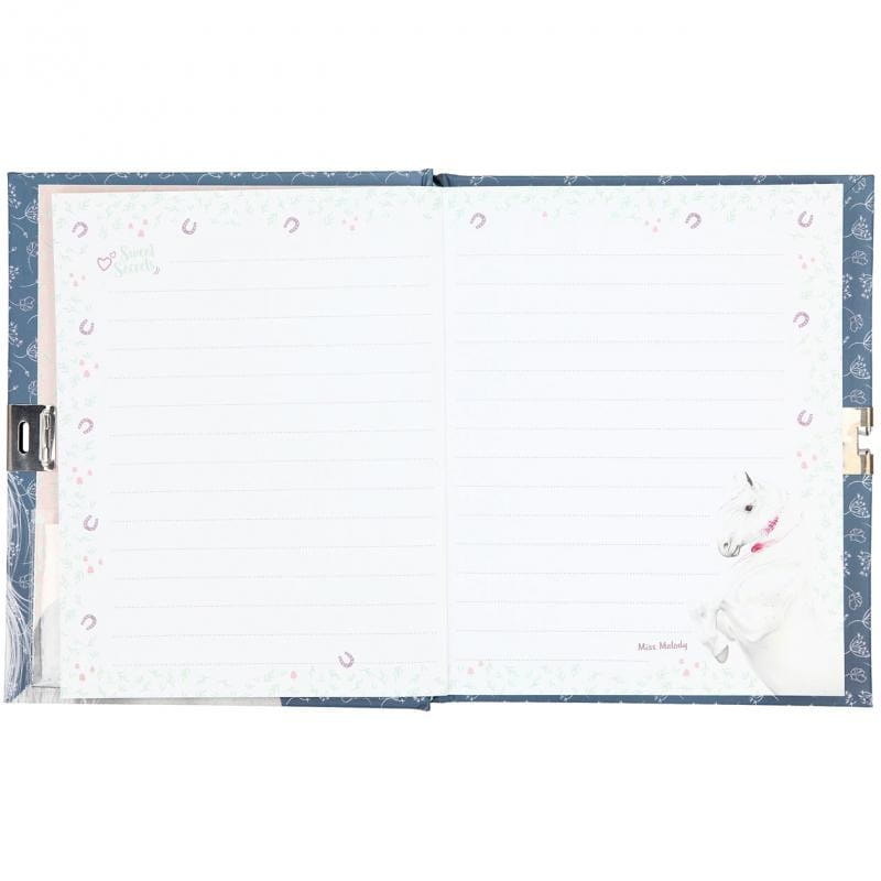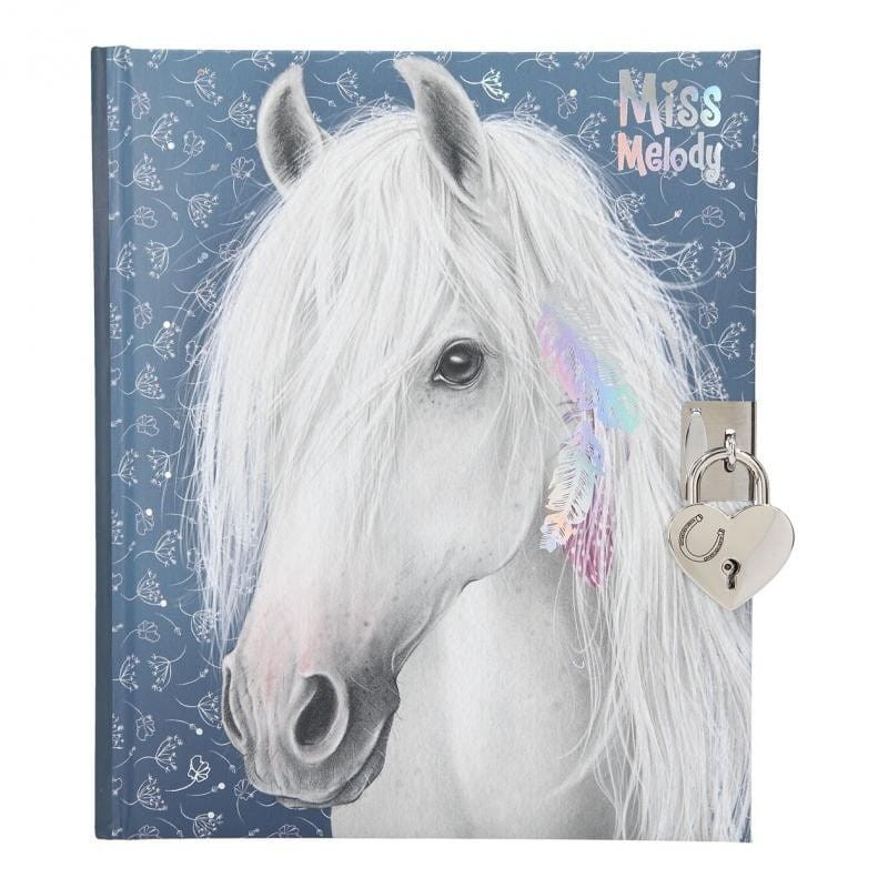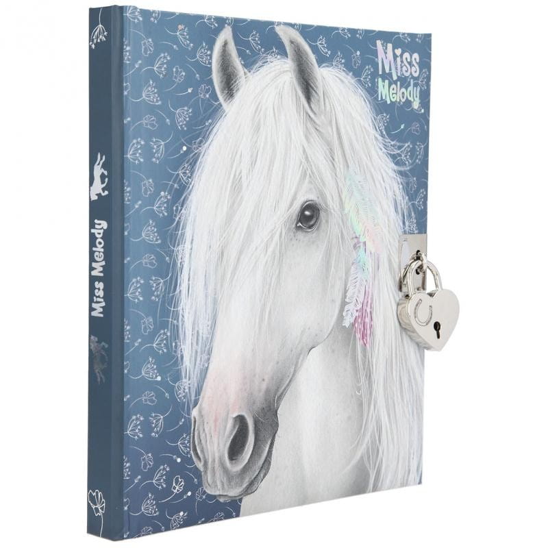 Pamiętnik Miss Melody zamykany na kłódkę w kształcie serca z wygrawerowaną podkową, w komplecie z kluczykiem oraz z 2 arkuszami naklejek włożonymi w kieszonkę wewnątrz okładki. Pamiętnik liczy aż 192 strony, gdzie dziewczynka może zapisywać swoje sekreciki oraz wykonywać szkice i rysunki, a w kieszonkę schować liściki od przyjaciółki.