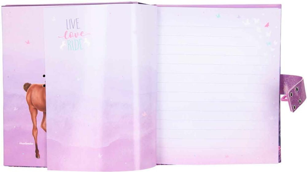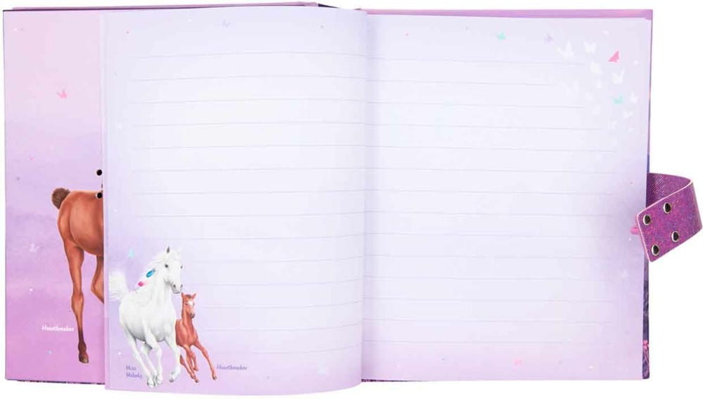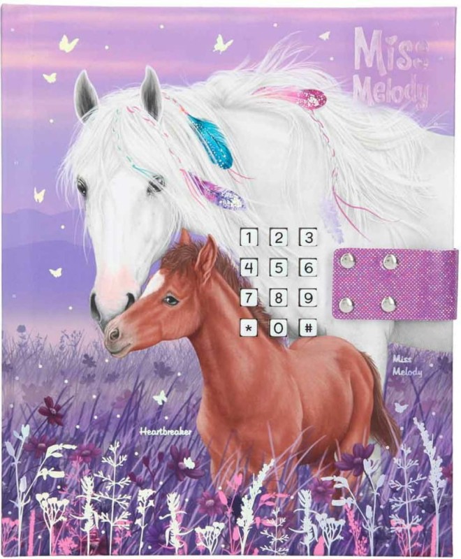 Pamiętnik liczy 100 fioletowych strony w linie, udekorowanych gwiazdkami i miniaturką galopujących koni. Tutaj dziewczynka może zapisywać swoje sekreciki oraz wykonywać szkice i rysunki. Pamiętnik z twarda okładką posiada brokatowe dekoracje oraz wypukły napis Miss Melody.