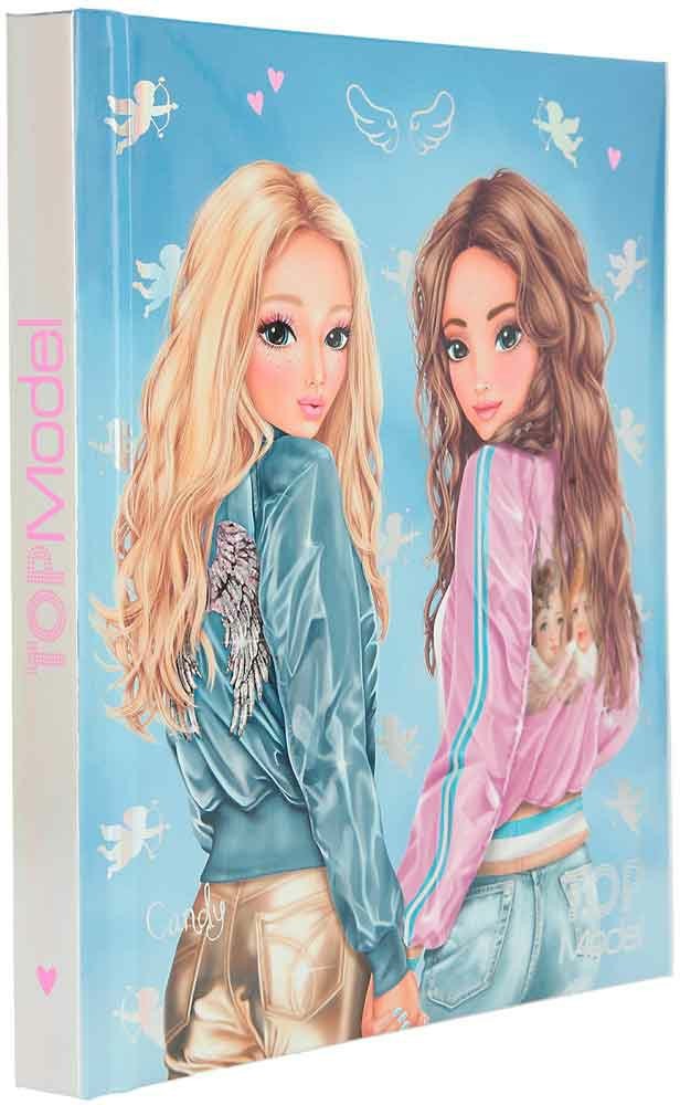 Pamiętnik oprawiony w twardą okładkę w kolorze błękitnym, przedstawia modelki Candy i Hayden oraz posiada błyszczące amorki.