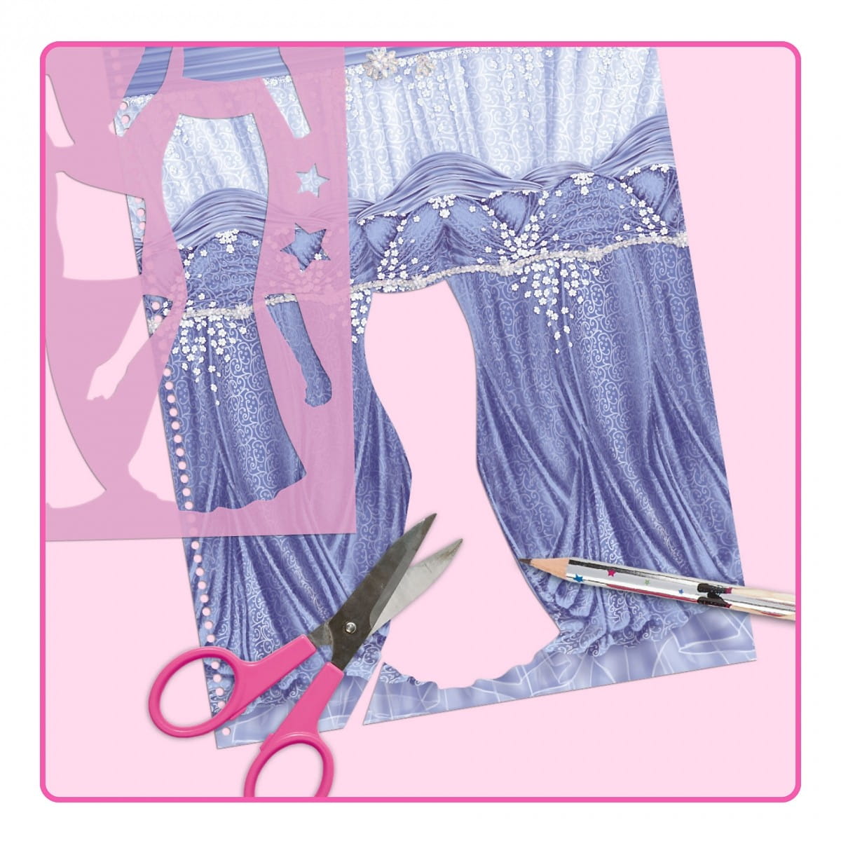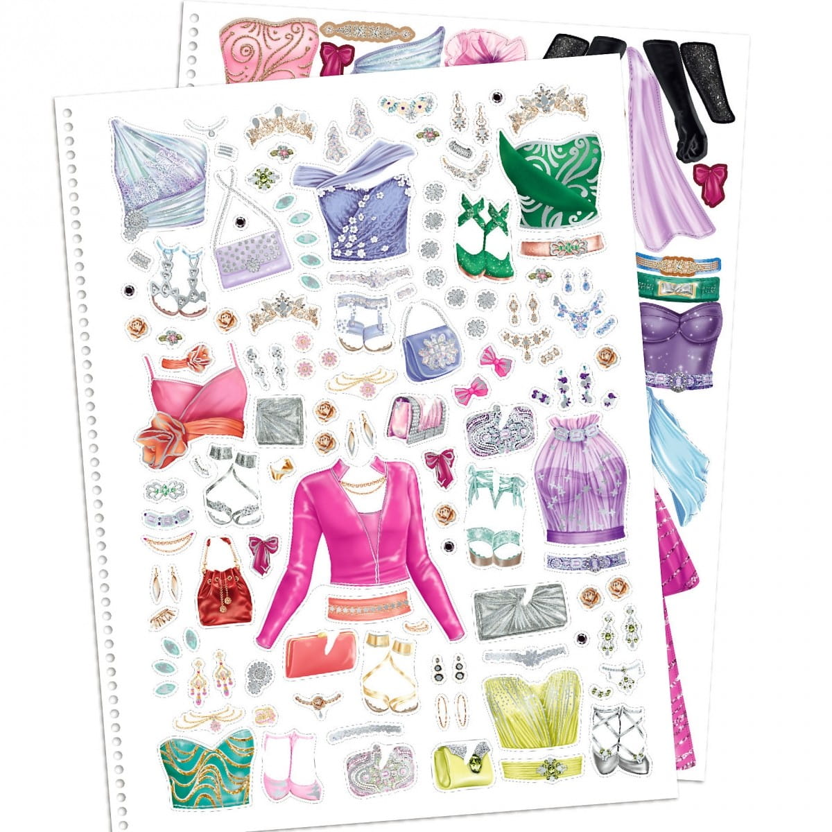 Kreatywna teczka, a w niej bogaty szkicownik Top Model Glamour Special. Ten zestaw będzie spełnieniem marzeń młodej projektantki mody. Każda dziewczynka marzy, by założyć najpiękniejszą suknię do samej ziemi. Wewnątrz teczki zapinanej na magnetyczne serduszko mamy naszkicowane sylwetki modelek oraz balowych kreacji, połyskujące elementy garderoby: gorsety, kwiatowe wykończenia, naszyjniki, pantofelki, suknie do tańca, ozdoby do włosów. Z załączonych na końcu szablonów odrysowuje się na papierowych wzorach tkanin suknie i dodatki, a następne wycina i przykleja do modelki.