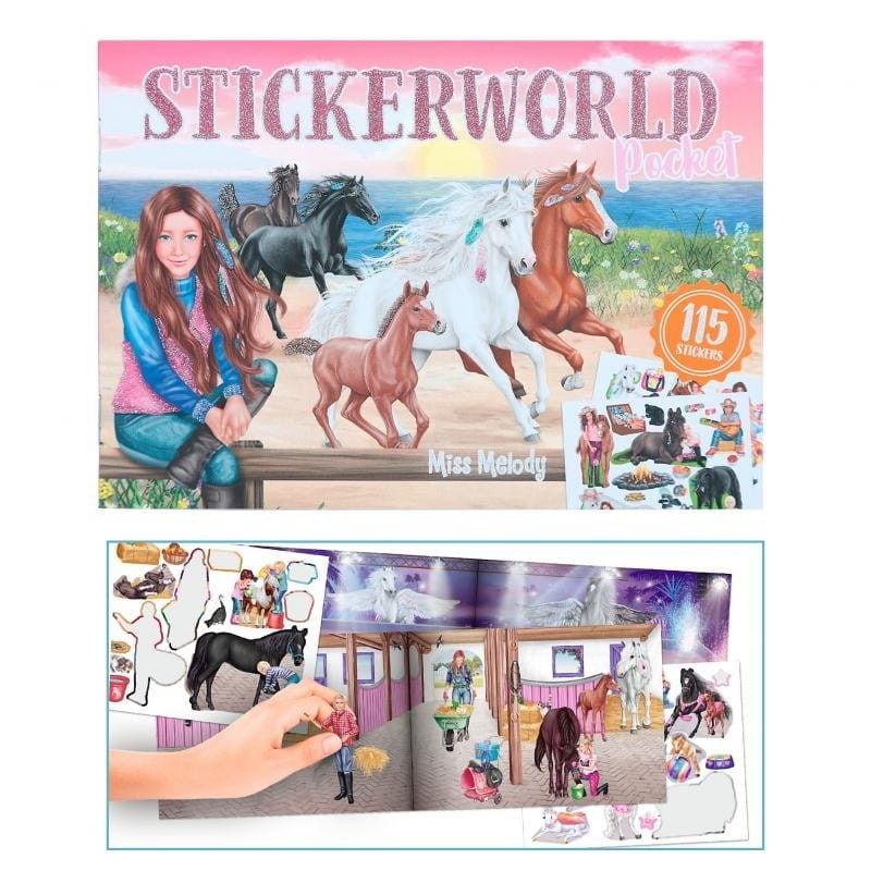 Pięknie wydany graficznie zestaw do naklejania i kreatywnej zabawy Miss Melody Stickerworld w formacie kieszonkowym.