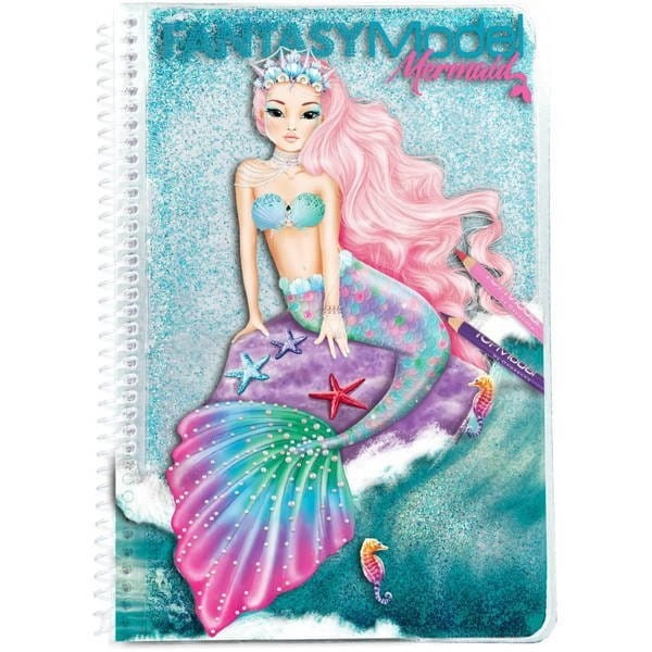 Notes na kołowrotku z brokatową okładką oraz naklejkami ma wewnątrz szkicownik. Dekorowanie syrenek będzie spełnieniem marzeń małej projektantki mody. Notes można mieć zawsze pod ręką i przy sobie, gdy do głowy wpadnie nowy projekt. Szkicownik zawiera arkusz z błyszczącymi naklejkami oraz obrysy sylwetek syrenek, do których domalowujemy ubrania, ryby, muszle, czy wodne kwiaty. Notes posiada miękką, trójwymiarową okładkę z płynnym brokatem.