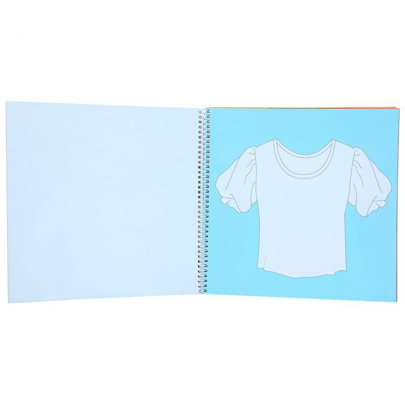 Kreatywny Notes Top Model T-shirt Designer będzie spełnieniem marzeń młodej projektantki mody. Szkicownik zawiera bluzki o różnym kroju, które ozdabiamy za pomocą modowych naklejek, wyciętych wzorów z szablonów oraz kolorujemy według własnej wyobraźni i pomysłów. Detale i odzież do naklejania są inspirowane modą młodzieżową, są błyszcząca i posiadają motywy bardzo na czasie. Stwórz swój własny, oryginalny print na T-shircie.