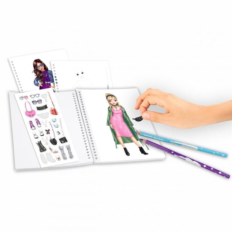 Kieszonkowy notes szkicownik Create your Top Model Pocket będzie spełnieniem marzeń małej projektantki mody. Notes wielkości A6 można mieć zawsze pod ręką i przy sobie, gdy do głowy wpadnie nowy projekt. Szkicownik zawiera arkusz z naklejkami oraz obrysy sylwetek, do których domalowujemy ubrania, buty, biżuterię, a nawet kolor i długość włosów. Notes posiada twardą okładkę z efektem 3D. Na każdej stronie jest misce na wpisanie daty oraz podpisu projektanta.