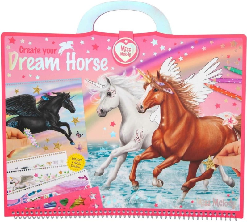 Kreatywna teczka, a w niej bogaty szkicownik Miss Melody Dream Horse do kolorowania, naklejania i odrysowywania. Ten zestaw będzie spełnieniem marzeń miłośniczki koni i jednorożców. Wewnątrz teczki zapinanej na magnetyczne serduszko mamy naszkicowane konie w galopie, jednorożce, pegazy pośród kwiatów, połyskujące naklejki z końmi oraz kwiatami, symbolami i napisami,a także szablon do odrysowywania wzorów.