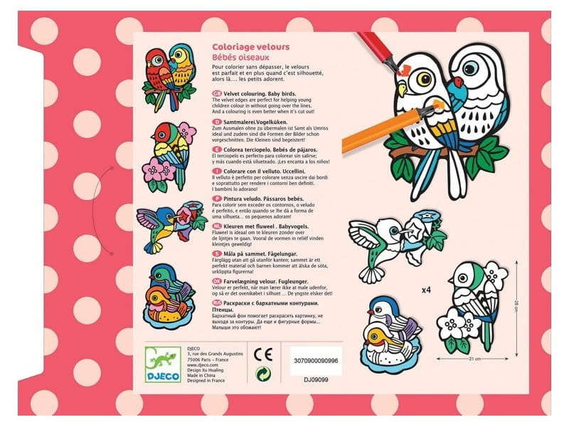 Kolorowanka z czarnym tłem Djeco pomaga dzieciom w kolorowaniu bez wyjeżdżania za linię. Gdy pomaluje się obok, aksamit wchłania kolor. Kontrastowe wypełnienie kartki ułatwia malowanie, obrazki stają się bardzo żywe i wyraźne. Aksamitne tło kolorowanki jest bardzo miłe w dotyku, a powstałe prace udekorują pokoik lub staną się osobistym prezentem dla najbliższych. Ptaszki można także wyciąć z kartki i powstaną niepowtarzalne dekoracje.