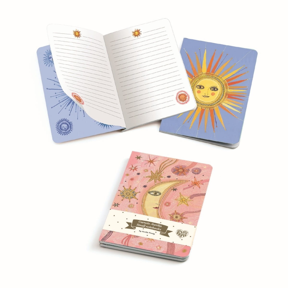 Kieszonkowe notesiki Djeco w pięknej szacie graficznej: połyskujące okładki z księżycem i słońcem. Zestaw liczy 2 notesiki: jeden w linie, drugi gładki.