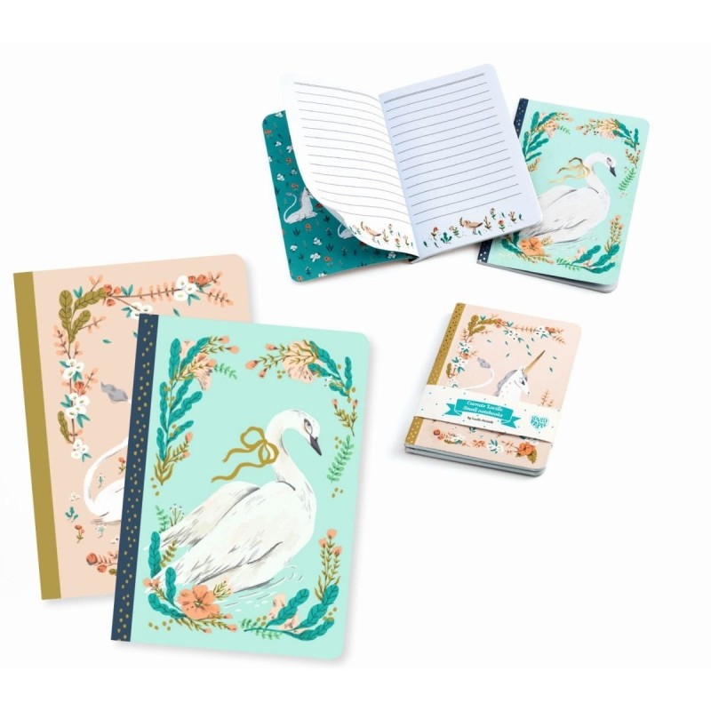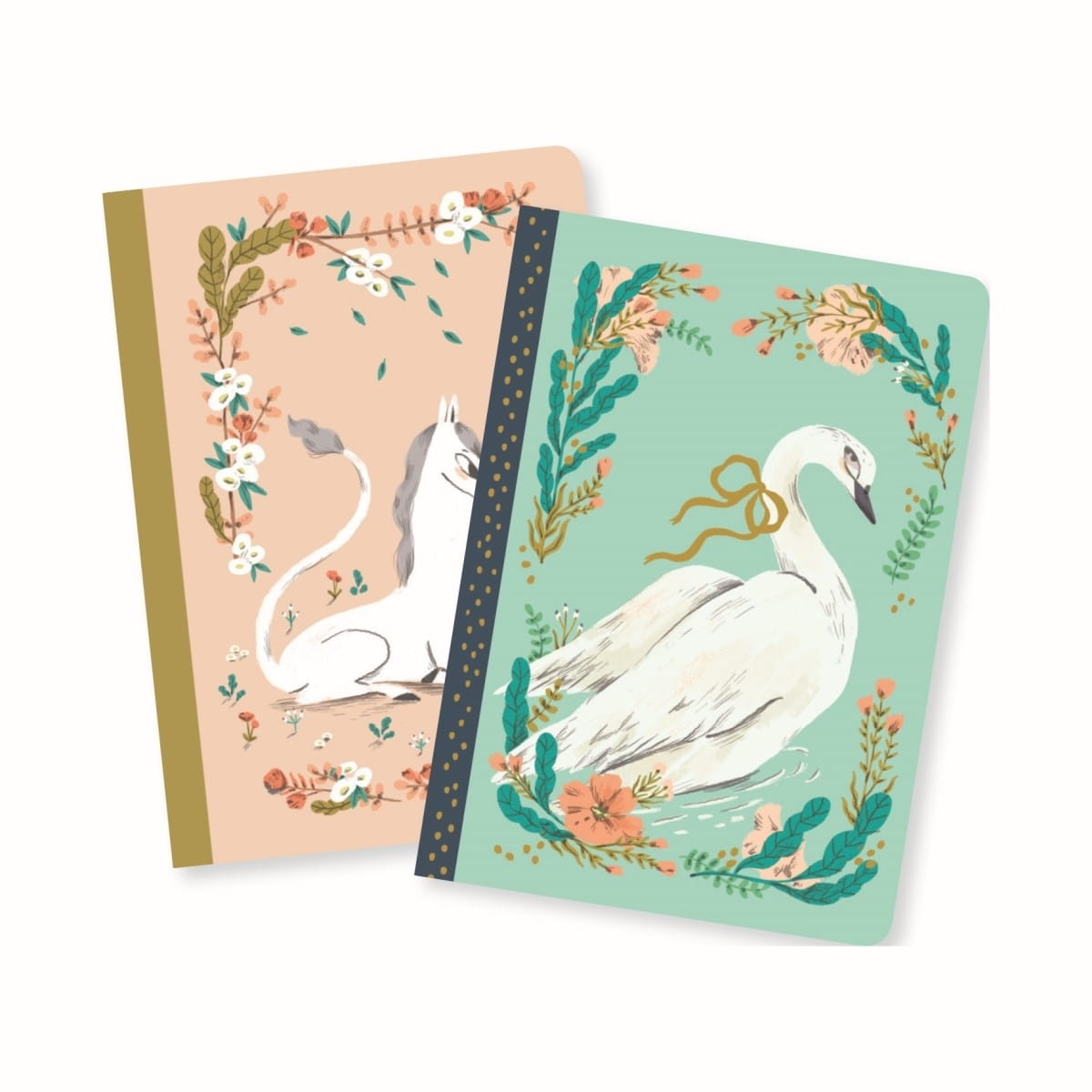 Kieszonkowe notesiki Djeco w pięknej stylizacji w pastelowych barwach z połyskującymi elementami na okładce. Zestaw liczy 2 notesiki: jeden w linie, drugi gładki. Elegancki, a zarazem romantyczny notesik do zapisywania codziennych spraw, zadań, pomysłów, planowania, wykonywania rysunków. Niewielki rozmiar i waga idealnie mieści się w torebce lub plecaku. Piękny prezent.