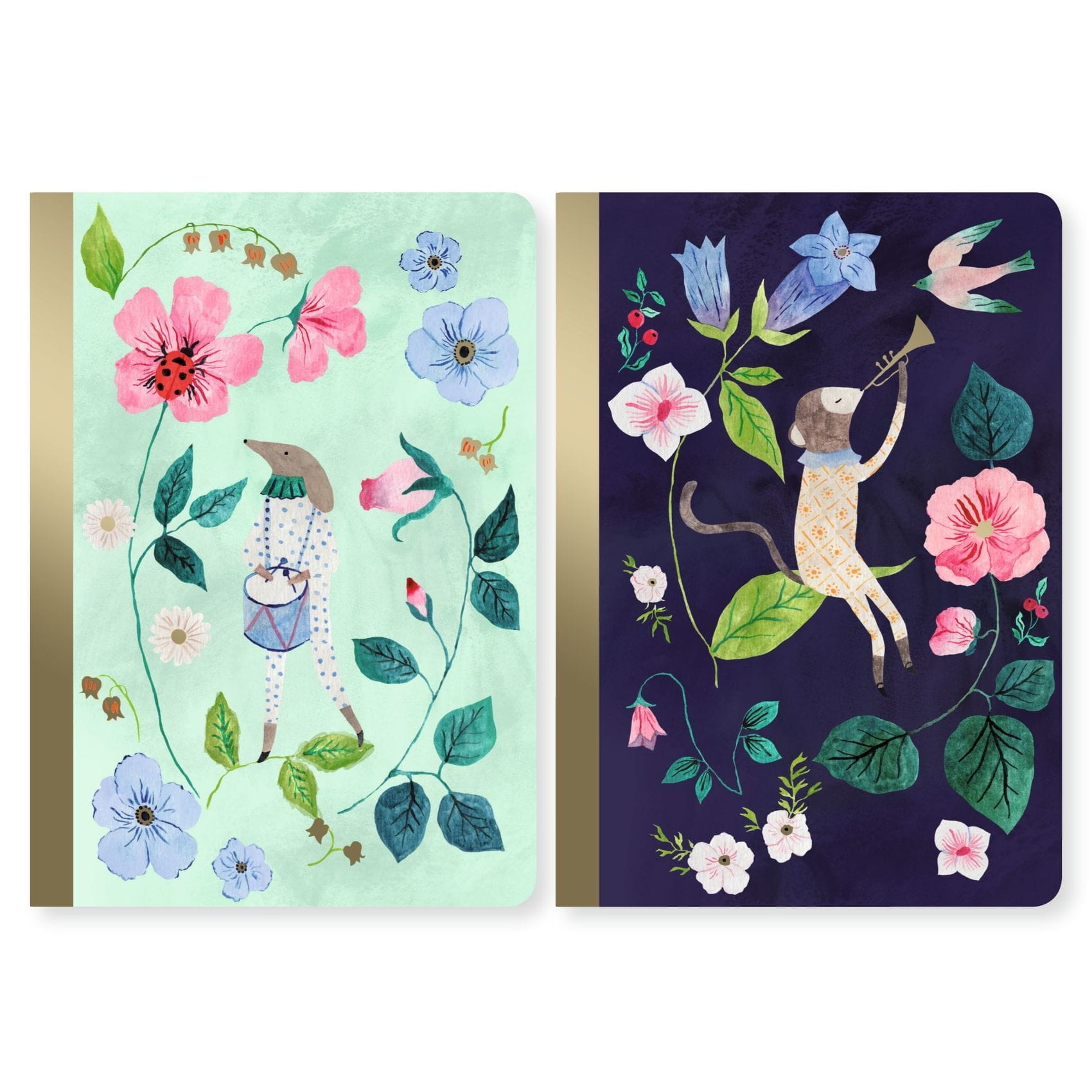 Kieszonkowe notesiki Djeco w pięknej szacie graficznej: połyskujące okładki z kwiatowymi motywami. Zestaw liczy 2 notesiki: jeden w linie, drugi gładki.