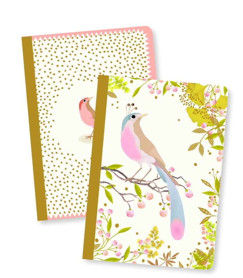 Kieszonkowe notesiki Djeco w pięknej stylizacji: złote, połyskujące okładki z ptakami. Zestaw liczy 2 notesiki: jeden w linie, drugi gładki.