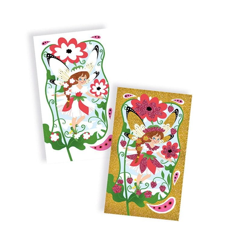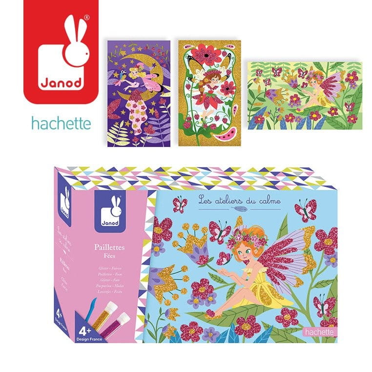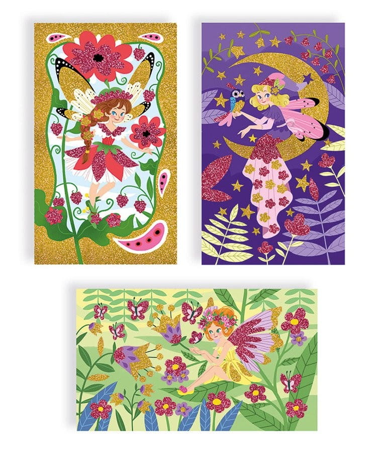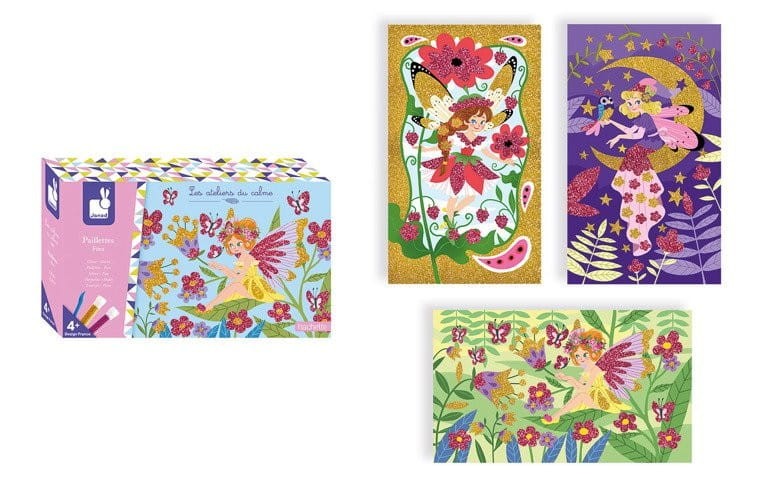 Artystyczny zestaw Wróżki Janod polega na ozdabianiu 3 obrazków przy pomocy brokatu w kolorze złotym i bordowym. Wróżki otoczone są bajeczną roślinnością.