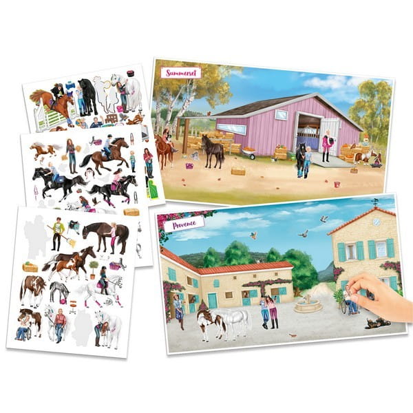Wewnątrz zeszytu mamy pięknie zilustrowane strony m.in. stajnię, siodlarnie, padok, krytą ujeżdżalnię, klinikę weterynaryjną, parkur, plac z przeszkodami, łąki i plażę po której mogą galopować konie. Do dekoracji przygotowano mnóstwo naklejek o różnych wielkościach, które bardzo realnie odzwierciedlają życie w stajni: czyszczenie, karmienie, trening konny, zawody jeździeckie, konie, kuce źrebaki. Wszystko bogate w szczegóły i nasycone końskimi detalami. Zachwycający komplet dla miłośniczek koni i jeździectwa.