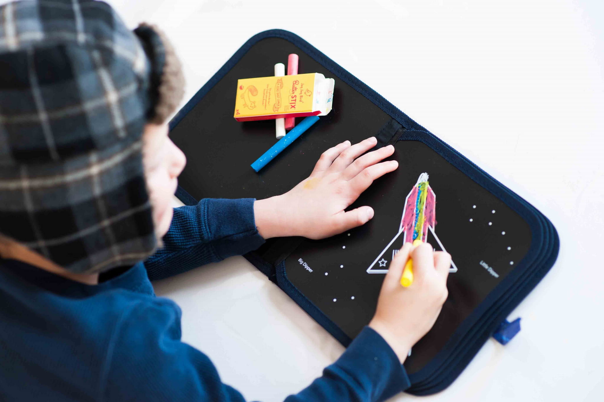 - W zestawie: książeczka do rysowania, 4 bezpyłowe kredy ButterStix