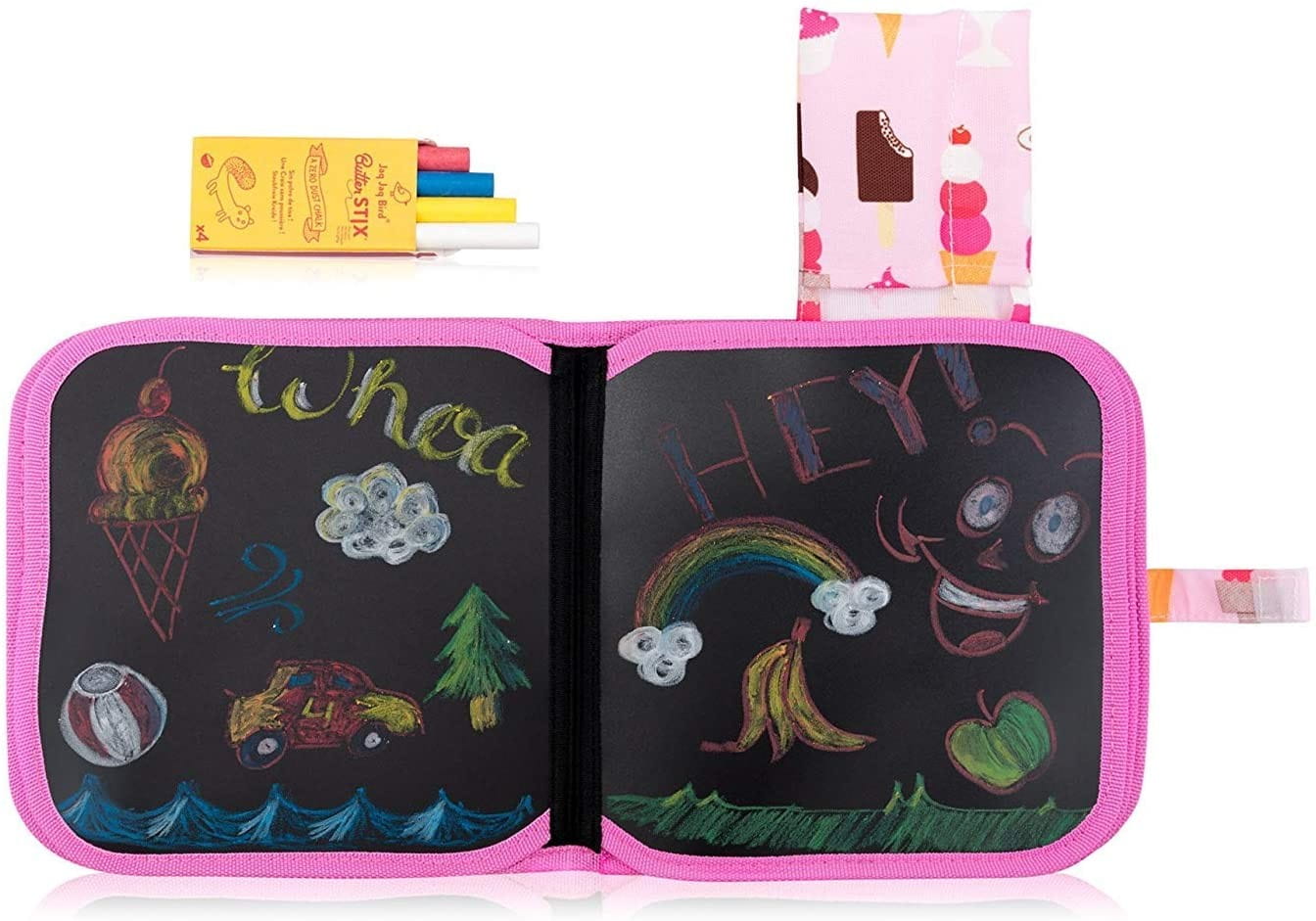 Kredowa książeczka Jaq Jaq Bird do wielokrotnego rysowania i zmazywania. Kolorowanka jest w zestawie z niepylącą kredą. Książeczka z czarnymi stronami, po których można bez końca malować kredą, czy zmywalnymi pisakami to pomysł na kreatywnie spędzony czas. 8 czarnych stron zapinanych na rzep oraz etui na kredę sprawia, że kolorowankę można zabrać wszędzie ze sobą. Kreatywna książeczka dobrze sprawdzi się w podróży i na wakacjach, we restauracji i każdej poczekalni, aby rozwiać nudę.