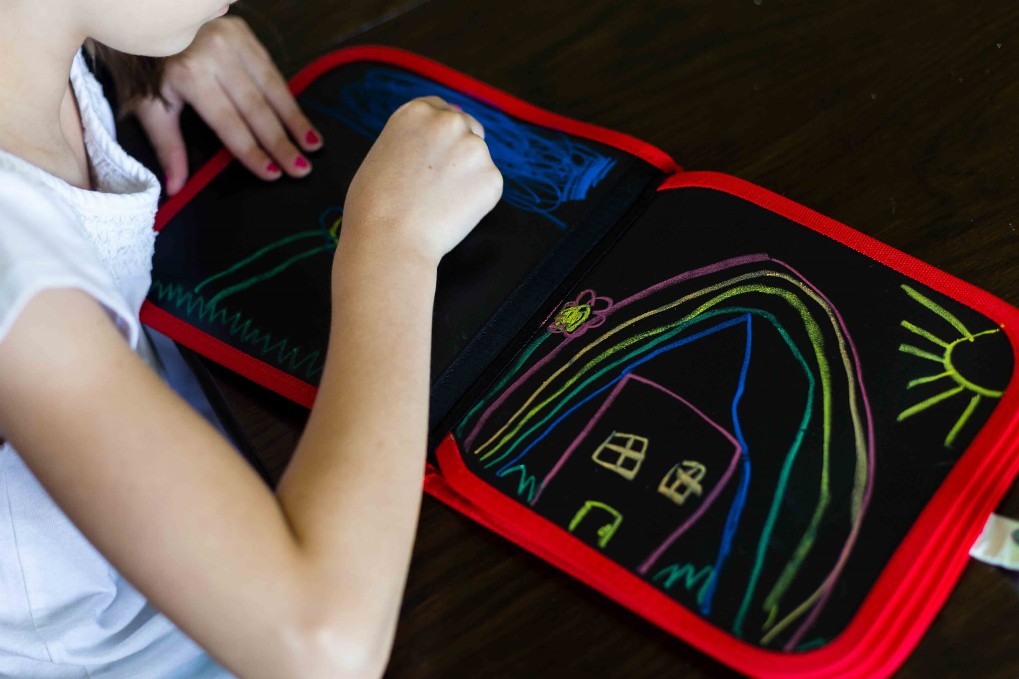 Kredowa książeczka Jaq Jaq Bird do wielokrotnego rysowania i zmazywania. Kolorowanka jest w zestawie z niepylącą kredą. Książeczka z czarnymi stronami, po których można bez końca malować kredą, czy zmywalnymi pisakami to pomysł na kreatywnie spędzony czas. 8 czarnych stron zapinanych na rzep oraz etui na kredę sprawia, że kolorowankę można zabrać wszędzie ze sobą. Kreatywna książeczka dobrze sprawdzi się w podróży i na wakacjach, we restauracji i każdej poczekalni, aby rozwiać nudę.