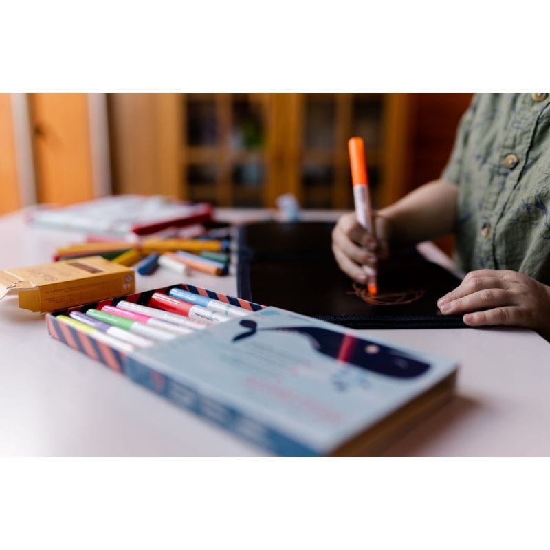 Pisaki ścieralne znakomicie i lekko prowadzą się podczas kolorowania stron neoprenowych książeczek Jaq Jaq Bird. Pisaki idealne do zabrania ze sobą i kolorowania w podróży.