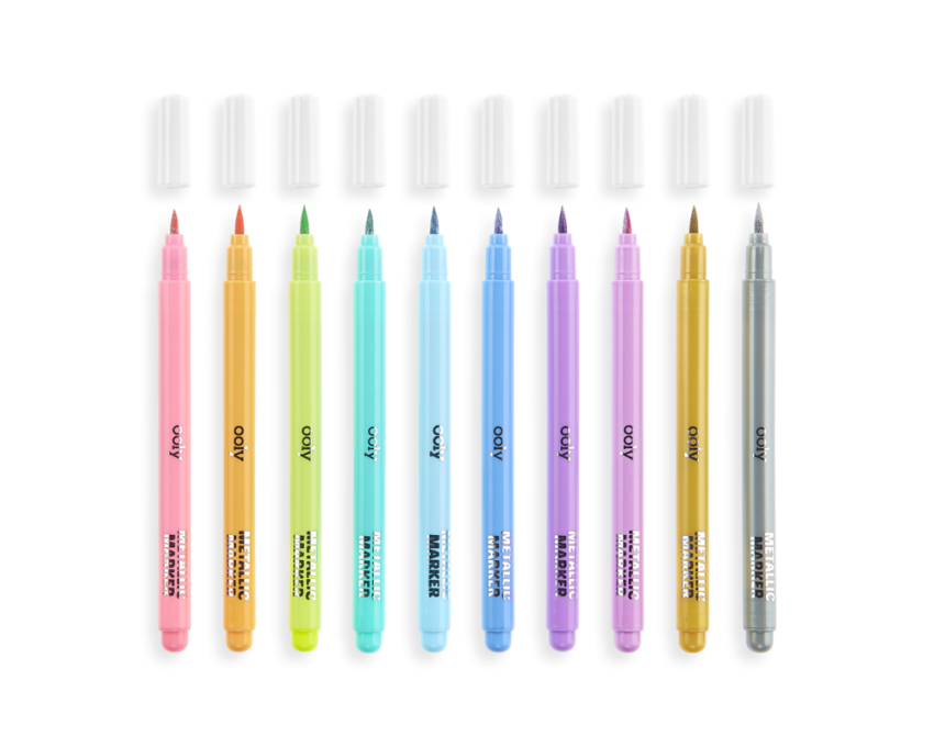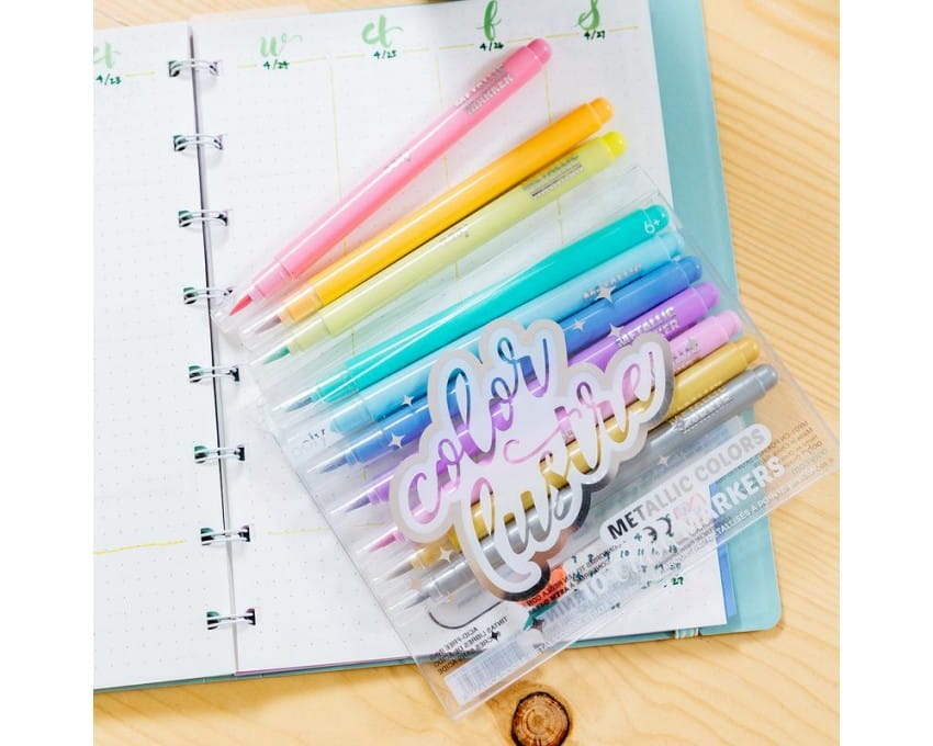 Metaliczne Flamastry z końcówką jak pędzelek, która umożłiwią pisanie i kolorowanie o różnej grubości. Pędzelkowe pisaki są idealne do malowania, kolorowania i kaligrafii. Specjalna końcówka pozwala używać mazaka jak pędzla, który długimi gładkimi pociągnięciami pozwoli stworzyć piękny napis lub rysunek. Kształt pędzelka pozwala zmieniać grubość linii, od szerokich pociągnięć po precyzyjne linie i punkty. Metaliczny połysk zaś doda eleganckiej głębi kolorom. Z