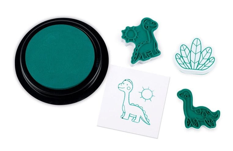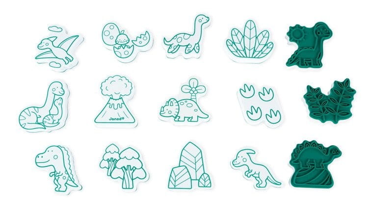 Kreatywny zestaw Janod zawiera 15 stempelków z dinozaurami, roślinnością, wulkanem oraz tusz. Stempelki są duże i okrągłe, łatwe w trzymaniu i odciskaniu już przez półtoraroczne dziecko. Za pomocą znaczników można odciskać pradawne gady na kartce papieru, a potem je pokolorować, wyciąć i opowiadać historie. Ta zabawa pochłania dziecko na długo, przy okazji ćwiczy koncentrację, sprawność manualną, rozwija wyobraźnie.