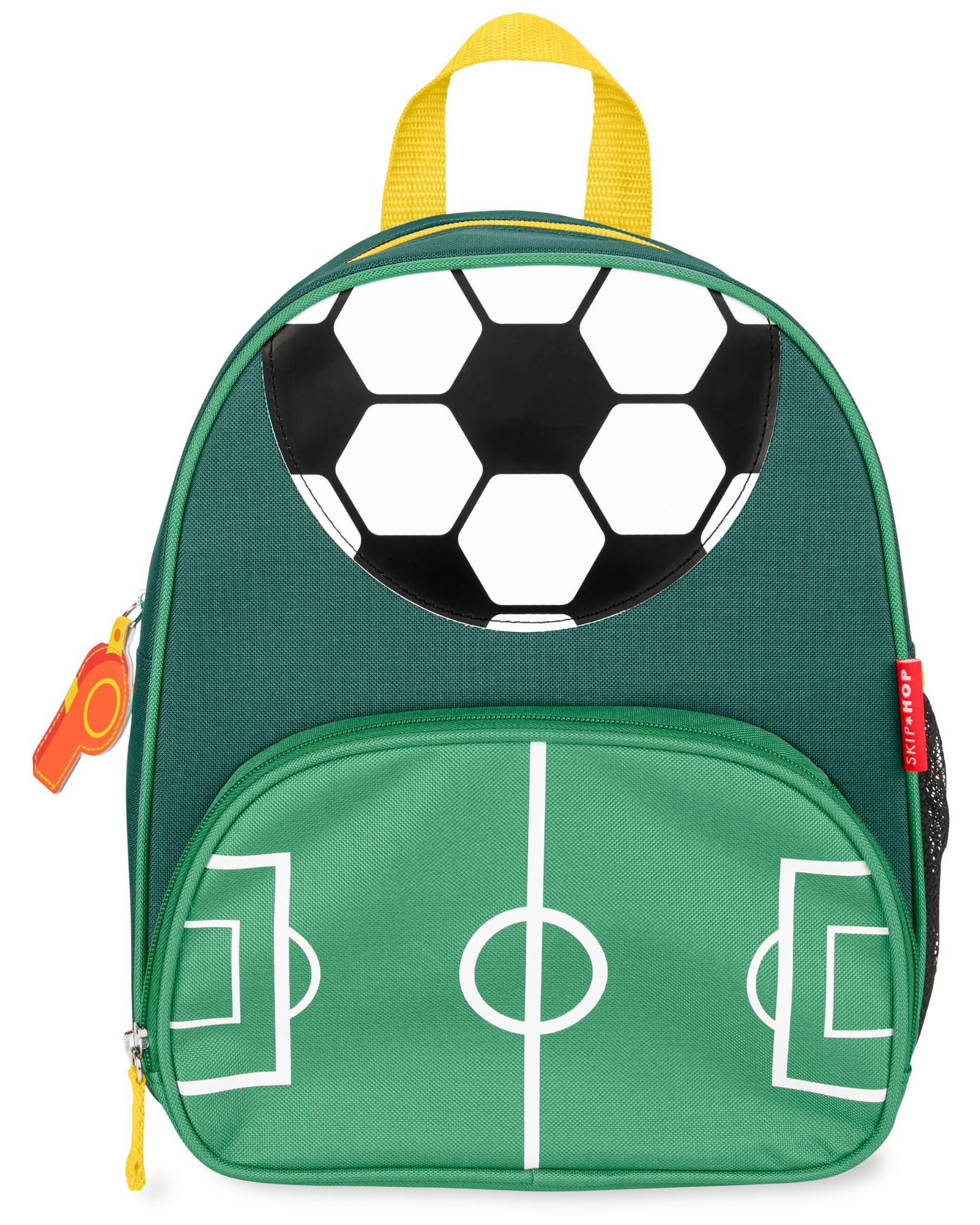 Plecak Skip Hop Soccer inspirowany motywem boiska piłkarskiego to odpowiednia torba dla przedszkolaka, ucznia i małego podróżnika. Jest kolorowy, lekki, wygodny, wytrzymały i przeuroczy. Pomieści ulubione zabawki i książeczki, bidon lub butelkę z wodą, śniadaniówkę, ubrania na zmianę oraz wszystkie ważne skarby dziecka. Znakomity plecak dziecięcy na wycieczkę, podróż, weekend u dziadków.