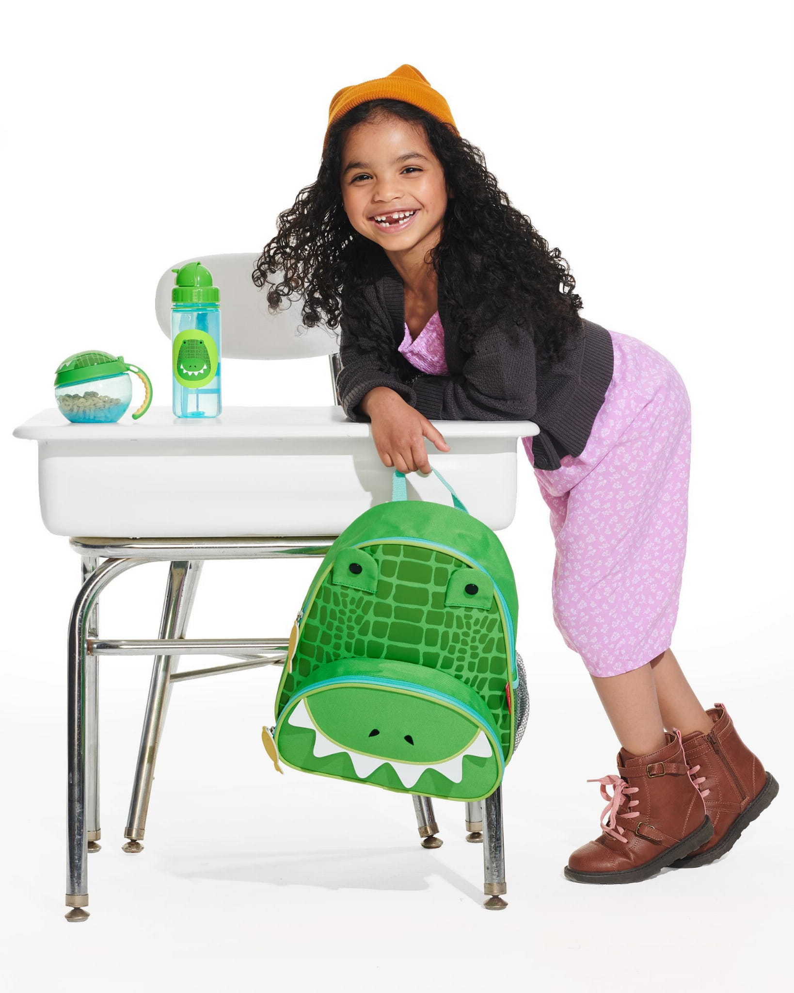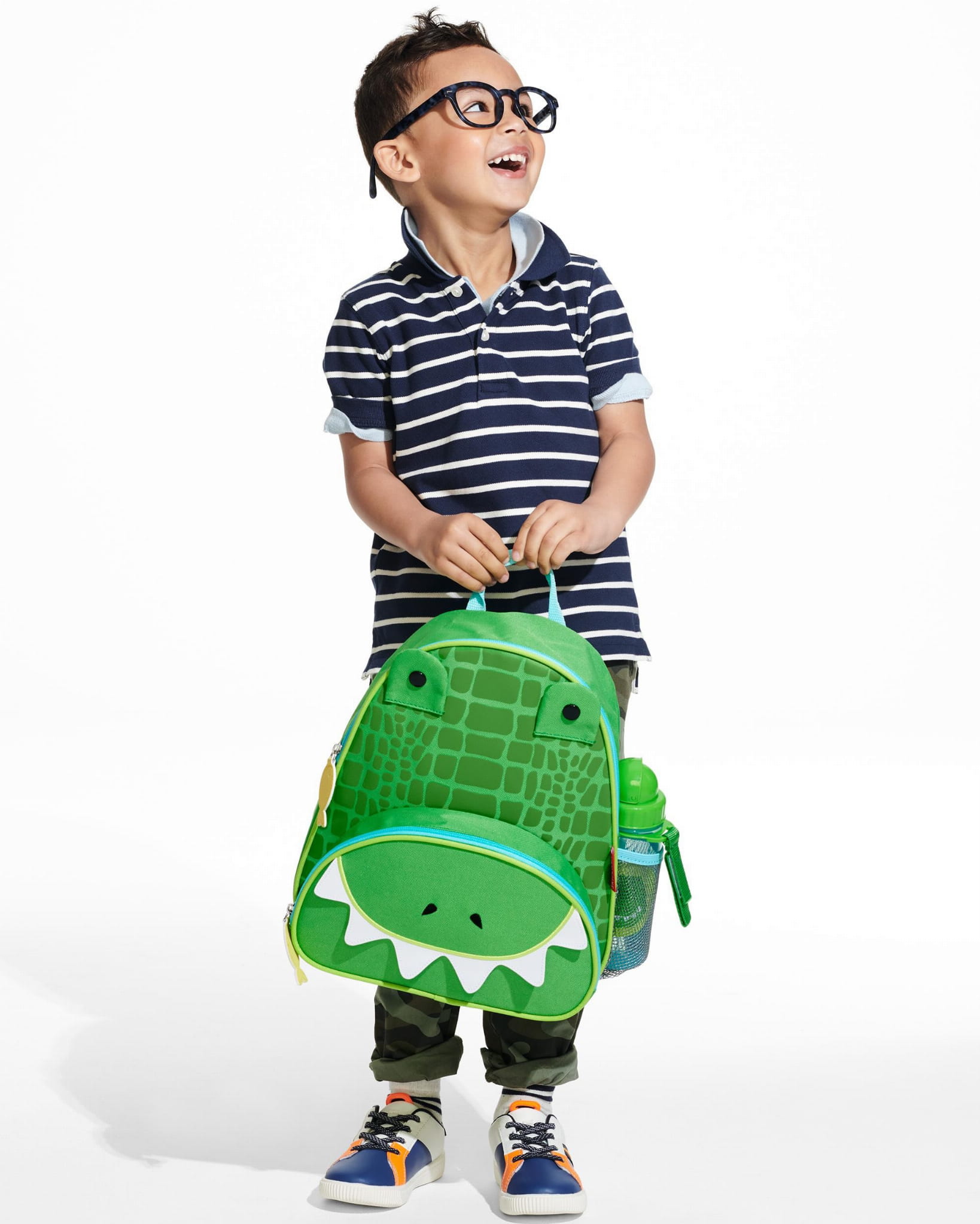 Plecak Skip Hop Crocodile inspirowany motywem zielonego krokoyla to odpowiednia torba dla przedszkolaka, ucznia i małego podróżnika. Jest kolorowy, lekki, wygodny, wytrzymały i przeuroczy. Pomieści ulubione zabawki i książeczki, bidon lub butelkę z wodą, ubranka na zmianę, śniadaniówkę oraz wszystkie ważne skarby dziecka. Znakomity plecak dziecięcy na wycieczkę, podróż, weekend u dziadków.