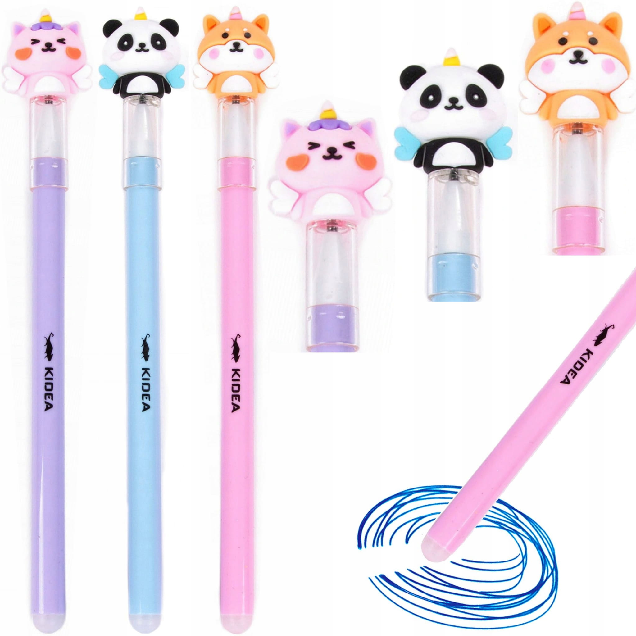Długopis wymazywalny z figurką w kształcie zwierzaka - zestaw 3 sztuki: panda, jednorożec i kotek. Zatyczka długopisu ozdobiona słodkim motywem uatrakcyjnia pisanie i sprawia, że dzieci czerpią ogromną radość z użytkowania długopisu. Dodatkowo figurki ozdobione skrzydełkami i rogiem jednorożca.