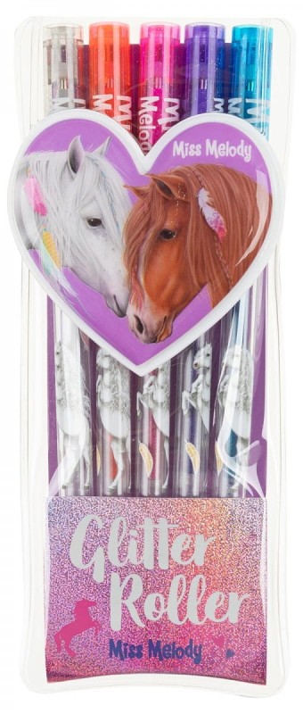 Brokatowe cienkopisy Miss Melody sprawią, że zeszyty, notesy, kartki urodzinowe, kolorowanki, rysunki i notatki zyskają blasku. Z brokatowymi długopisami każde dzieło wygląda pięknie, połyskuje i mieni się drobinkami. Długopisy z brokatem mają nasycone barwy, pięknie prowadza się w dłoni, lekko i przyjemnie piszą. Komplet 5 błyszczących długopisów przyda się w szkole, a podkreślone tak notatki szybciej zostaną zapamiętane. Długopisy w pięknym piórniczku zapinanym na rzep oraz wizerunkiem koni.
