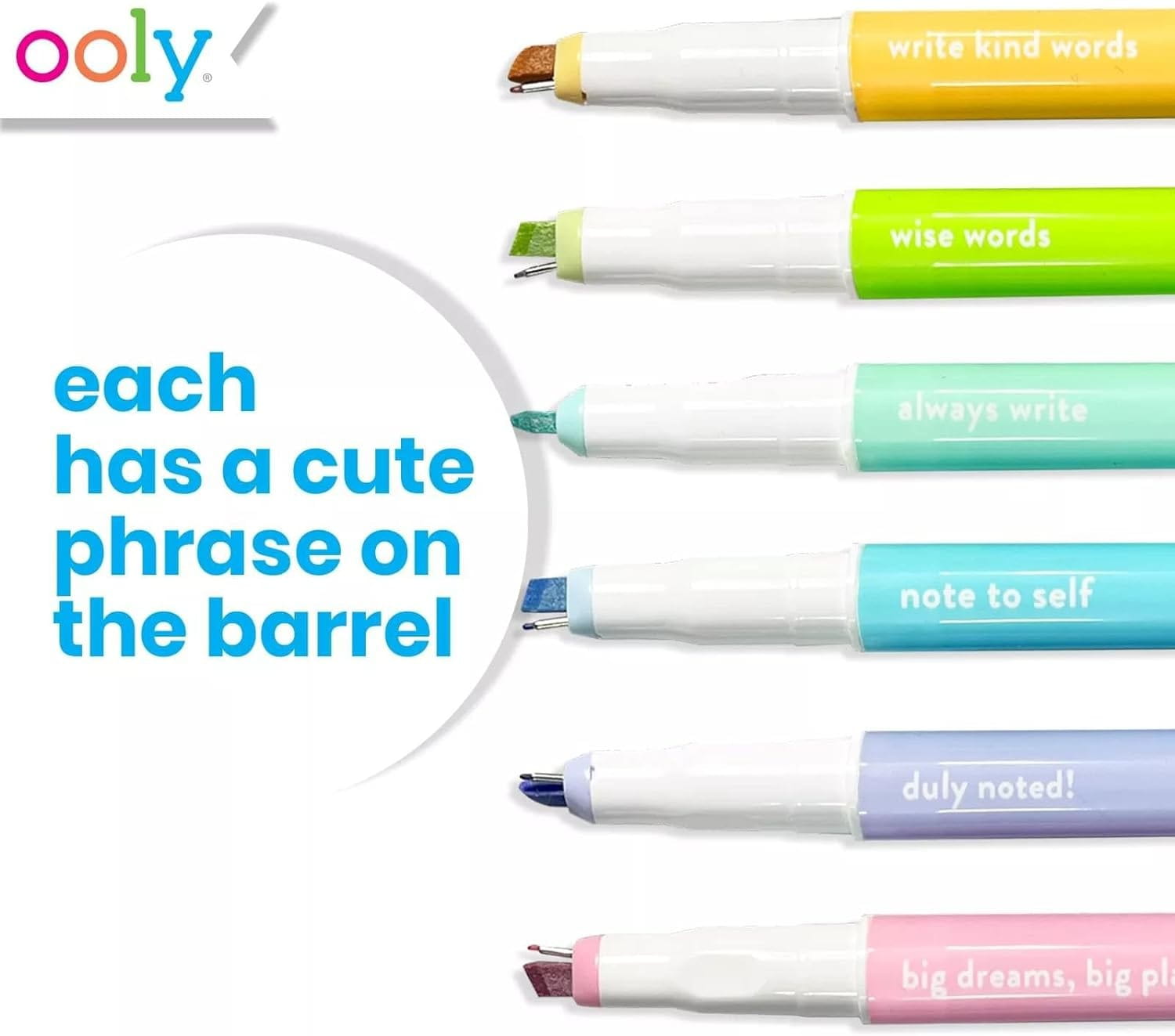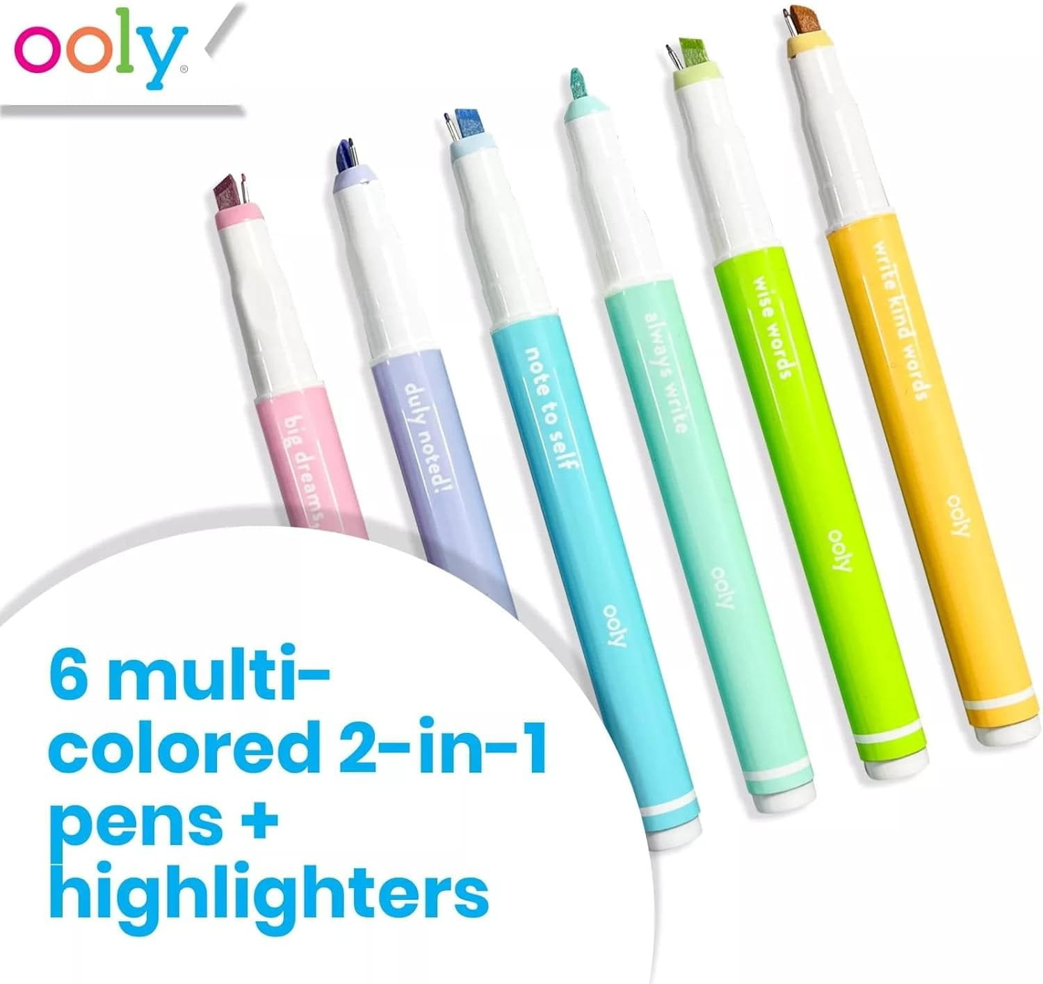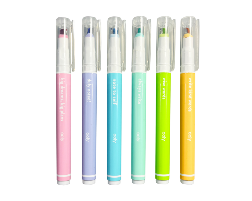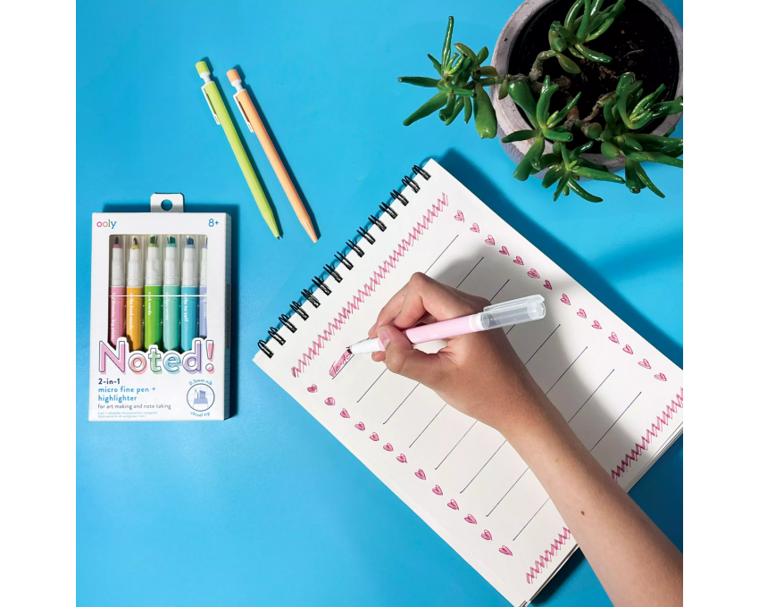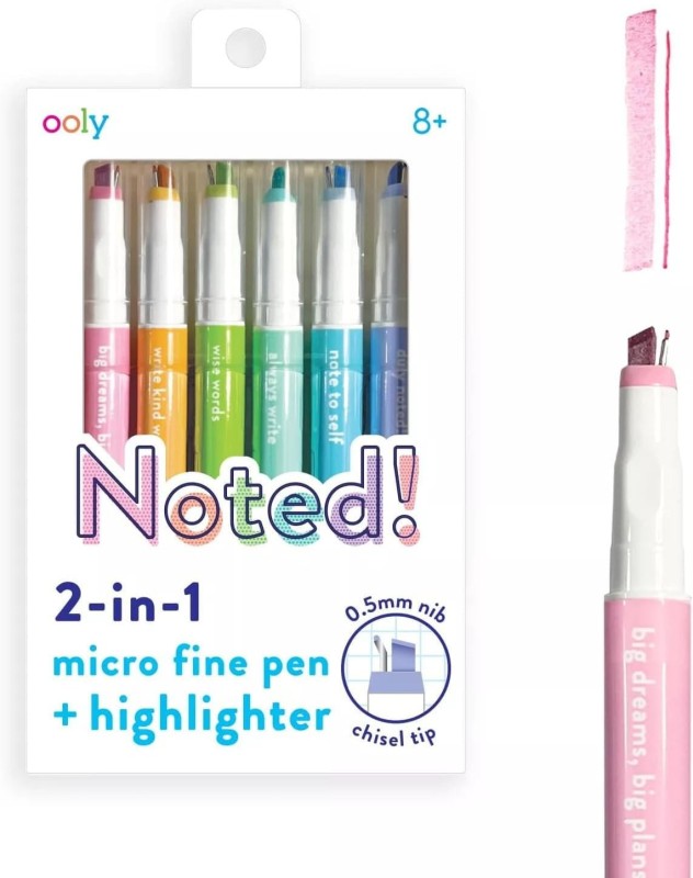 Zestaw "Noted! 2-in-1 Micro Fine Tip Pen and Highlighters - Set of 6" od OOLY jest wyjątkowo praktyczny i estetycznie wykonany, co czyni go świetnym dodatkiem do każdego zestawu artykułów papierniczych. Stanowi również doskonały pomysł na funkcjonalny prezent dla każdego, kto potrzebuje efektywnie i estetycznie organizować swoje zapisy.