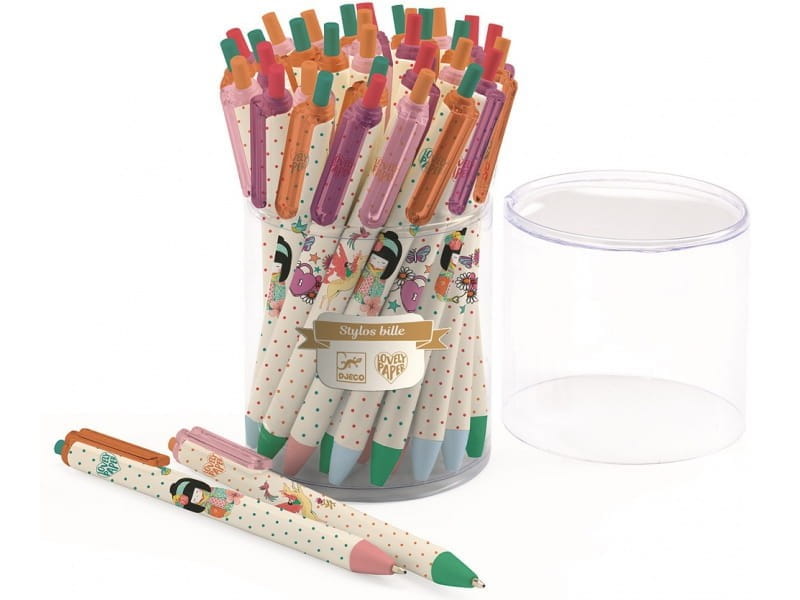 Ładny długopisy na prezent dla dziewczynki. Długopis Djeco jest opatrzony subtelną grafiką z jednorożcem, kłódką w kształcie serca lub japońskim wzorem. Długopis lekko i przyjemnie pisze, ma atrament w kolorze niebieskim.