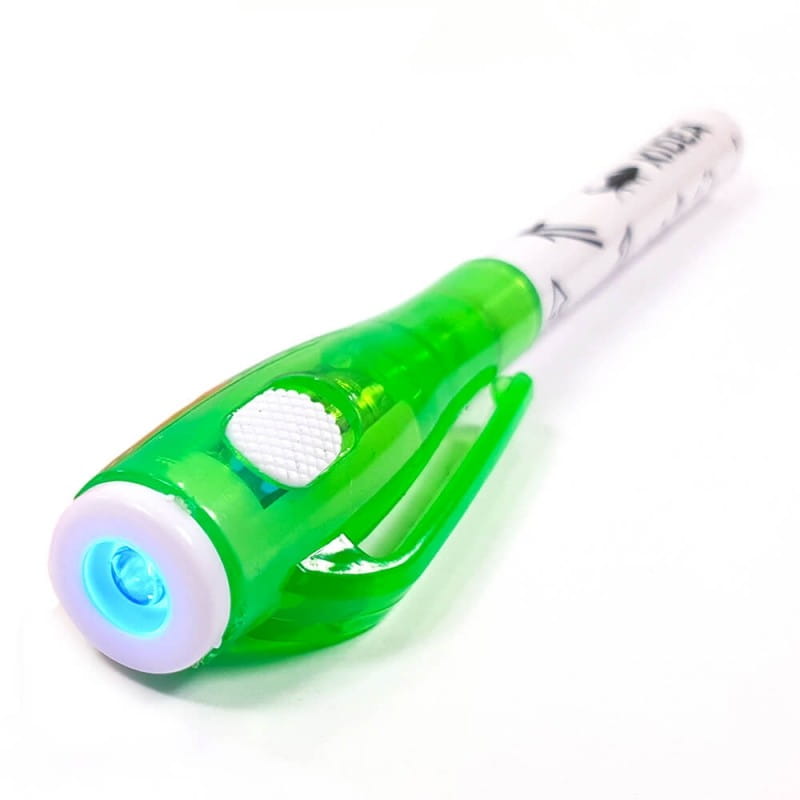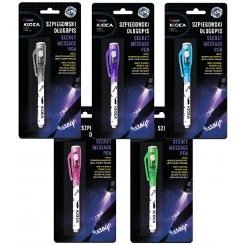 Długopis z latarką Kidea Secret message pen jest widoczny nawet w ciemności. Fluorescencyjny długopis pozwoli sporządzić w pamiętniku tajne zapasiki i obrazki. Sekreciki będą widoczne tylko po podświetleniu specjalną latarką, która znajduje się na końcu długopisu. Długopis posiada końcówkę z niewidzialnym tuszem, który ujawnia się po podświetleniu światełkiem latarki UV.