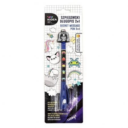 Długopis z latarką Kidea Secret message pen jest widoczny po podświetleniu w ciemności. Fluorescencyjny długopis pozwoli sporządzić w pamiętniku tajne zapasiki i obrazki. Sekreciki będą widoczne tylko po podświetleniu specjalną latarką, która znajduje się na końcu długopisu. Długopis posiada końcówkę z niewidzialnym tuszem, który ujawnia się po podświetleniu światełkiem latarki UV.