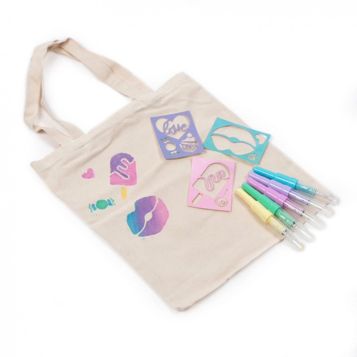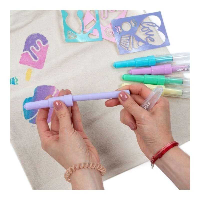 Markery do tkanin w sprayu Sweet Love z szablonami Kidea. W opakowaniu znajduje się pięć markerów w pastelowych kolorach: żółtym, różowym, fioletowym, niebieskim i zielonym, oraz trzy arkusze z szablonami.