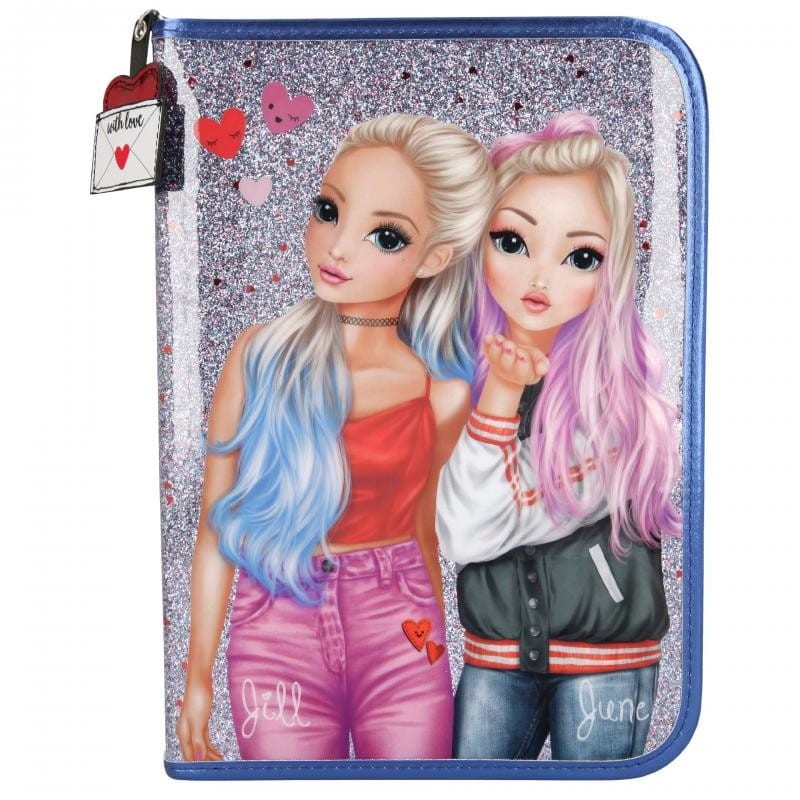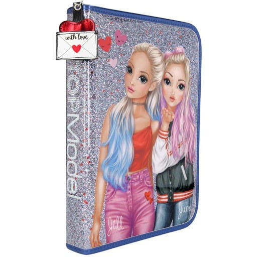Mieniący się piórnik z wyposażeniem Top Model w dużym rozmiarze, wewnątrz z otwieranymi klapami, plenem lekcji, lusterkiem i licznymi szkolnymi przyborami.